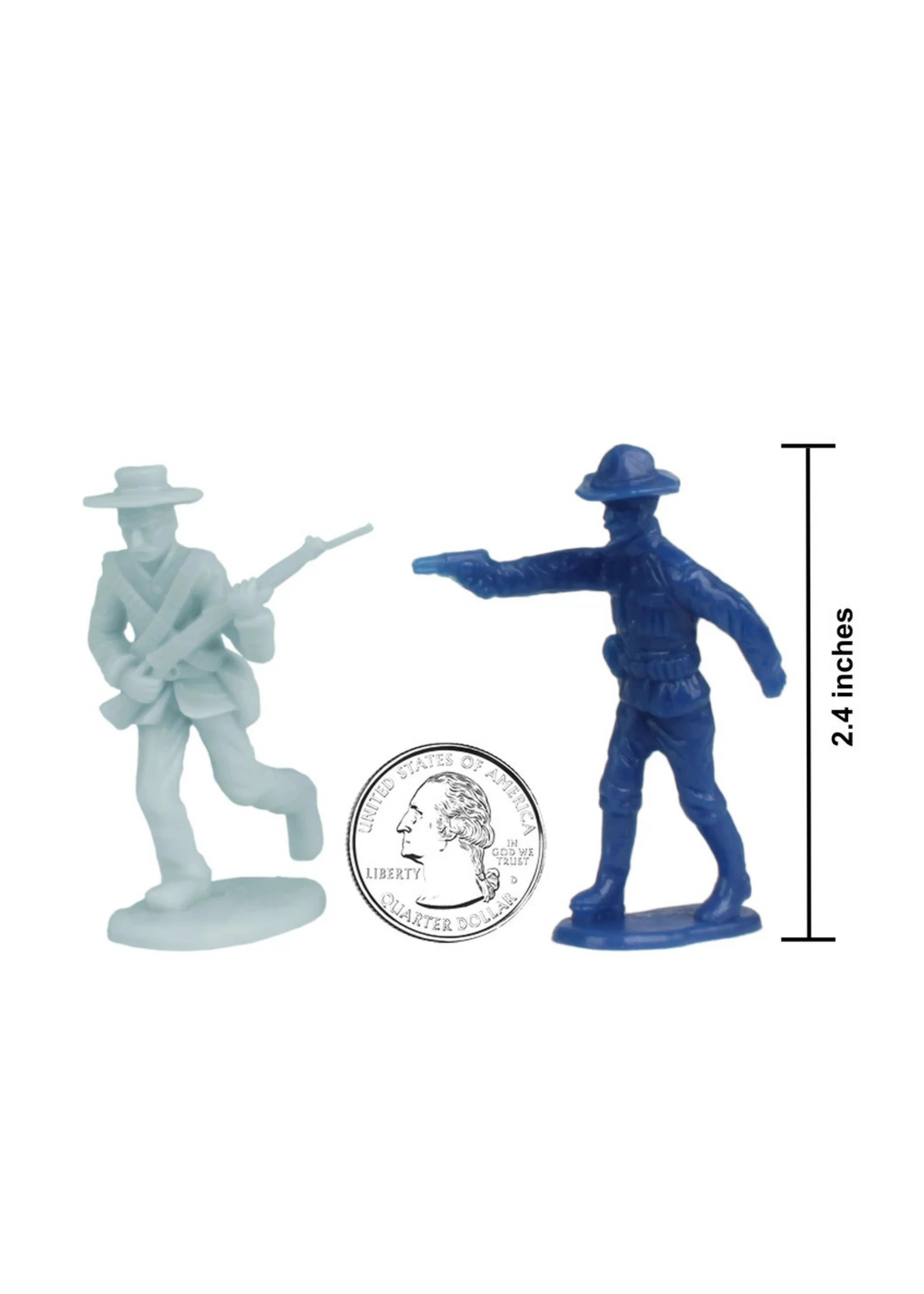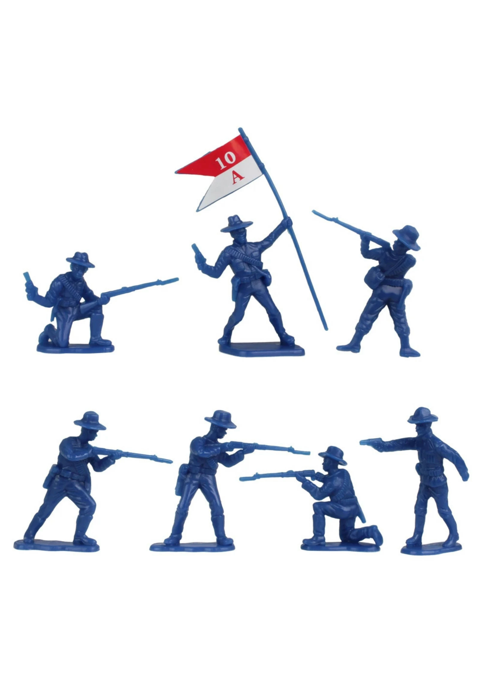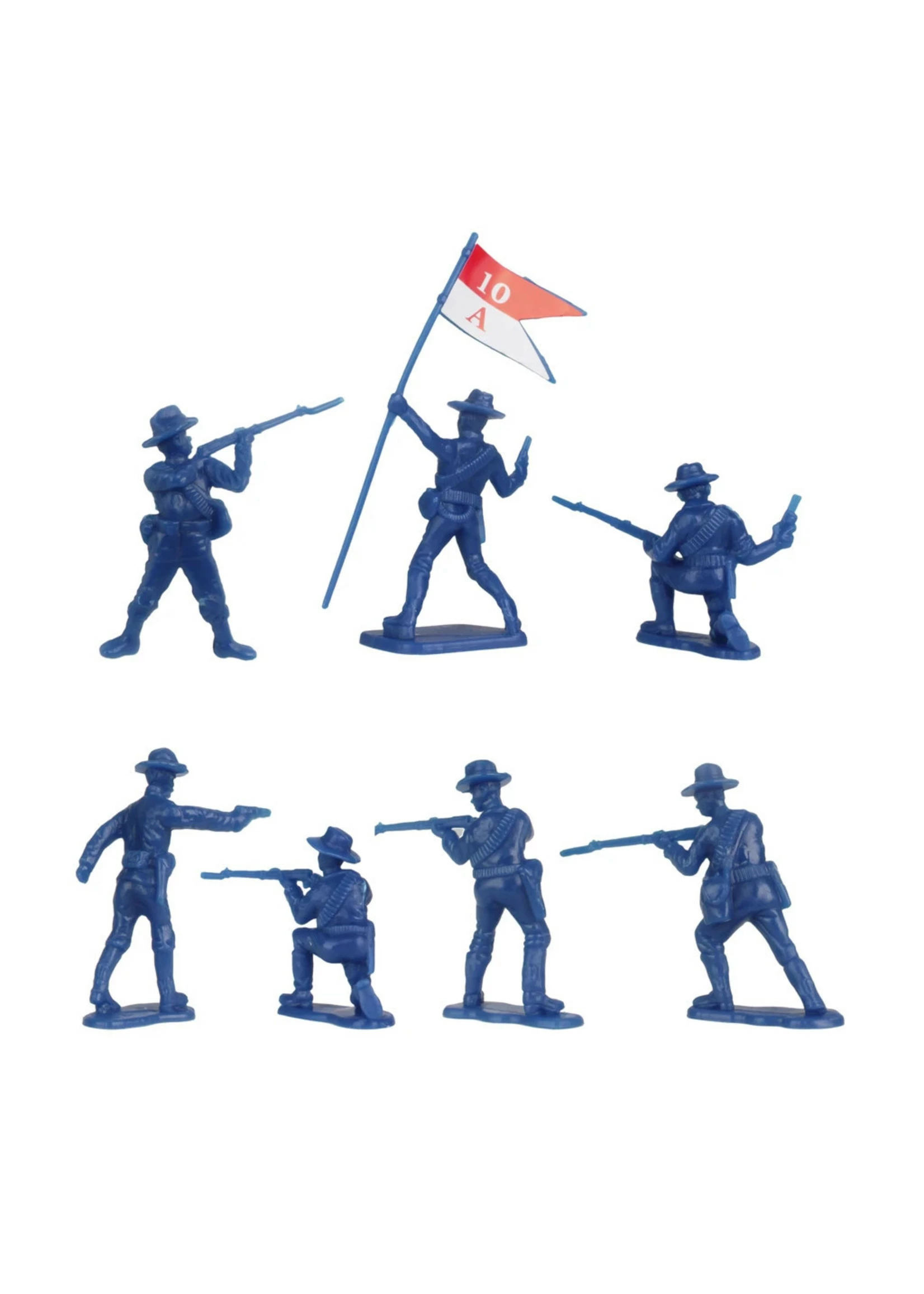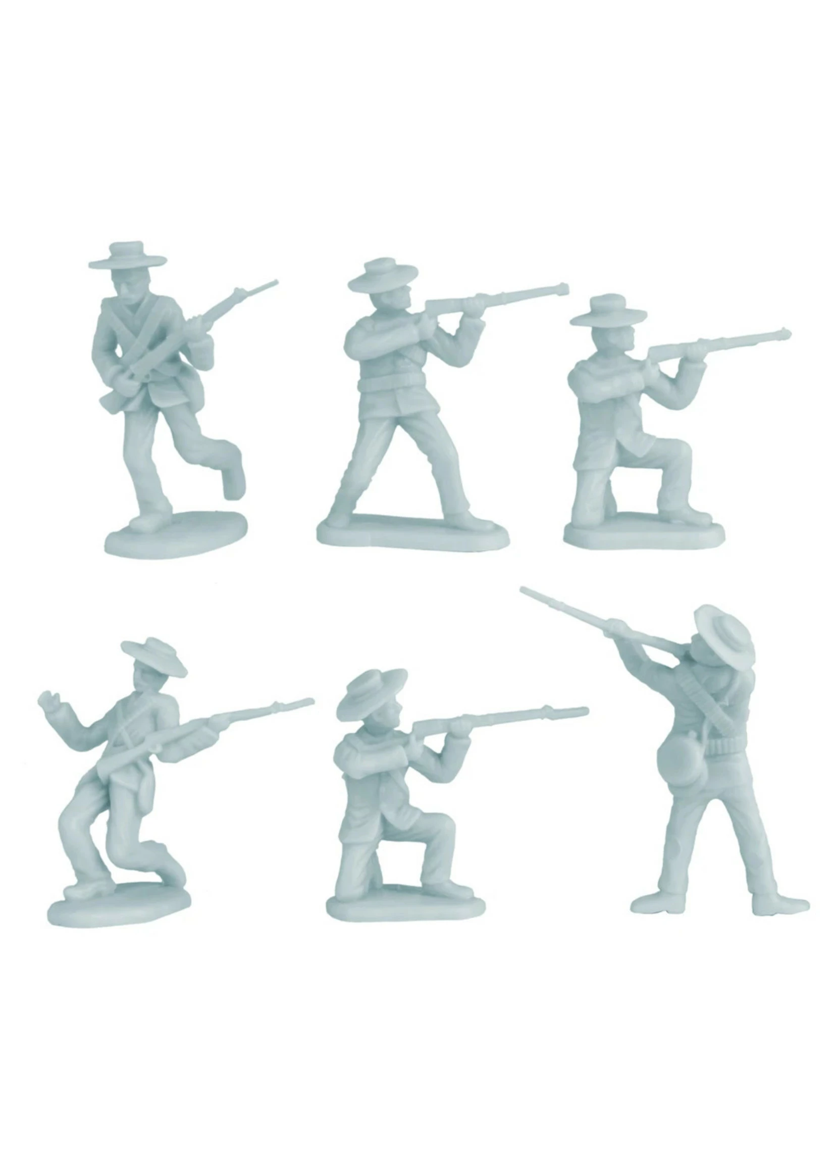 Made from fairly stiff, very durable, polypropylene plastic with medium detail and very little flashing, figures stand up to 2.25 inches tall and are about 1:32nd scale. These figures were first offered in 1999 as part of the BMC Toys THE ROUGH RIDERS CHARGE UP SAN JUAN HILL boxed playset and have not been produced in more than a decade. The 2019 release features new header card art and colors.