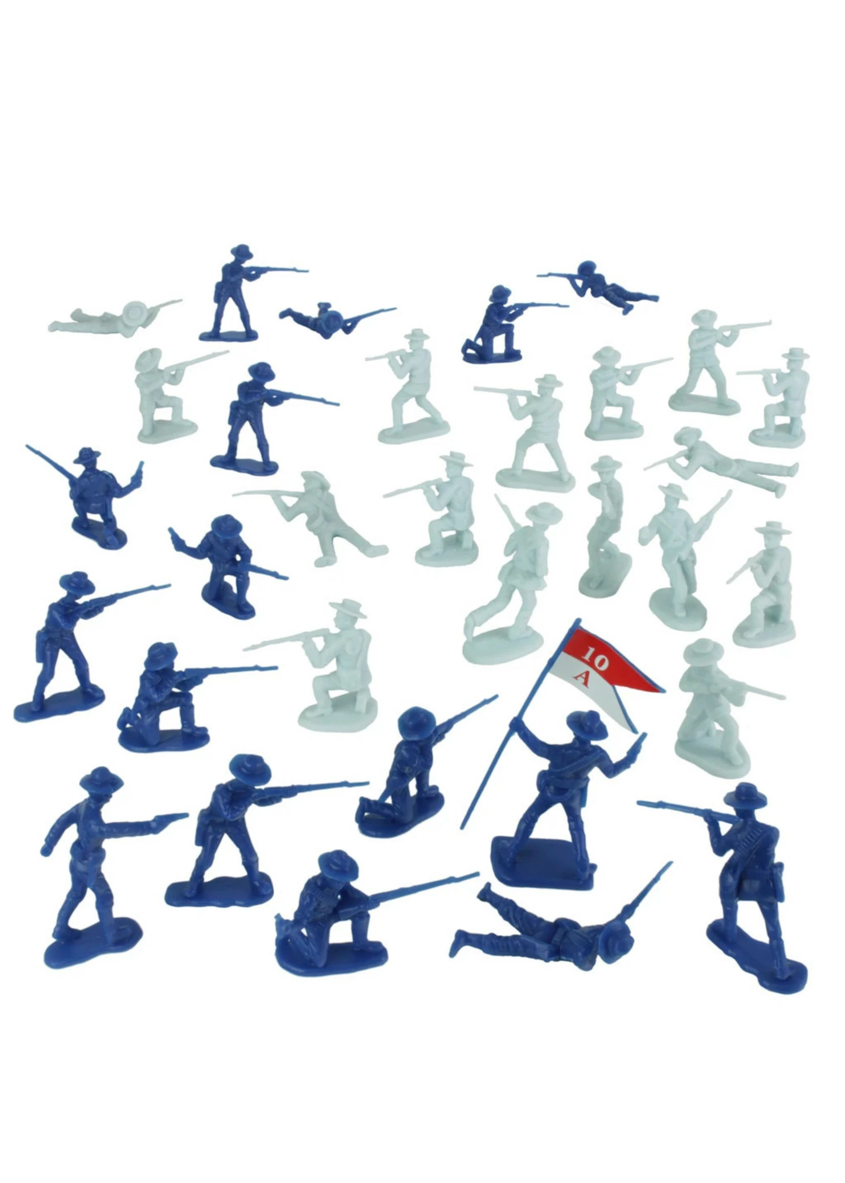 From the BMC Toys AMERICAN HERO COLLECTOR SERIES: The Buffalo Soldiers’ CHARGE UP SAN JUAN HILL 32 piece plastic army men set features 13 different figures and includes Sergeant George Berry, 1st Lieutenant John J. Pershing, 14 10th Calvary Buffalo Soldiers in Medium Blue, and 16 Spanish Soldiers in Light Bluish Gray to represent Rayadillo uniforms.