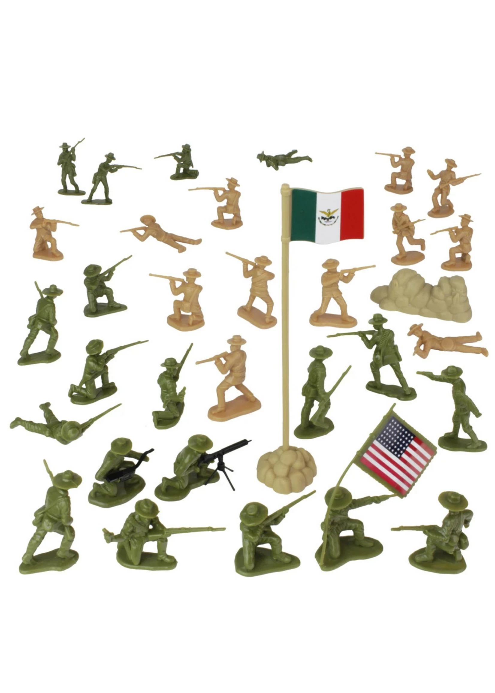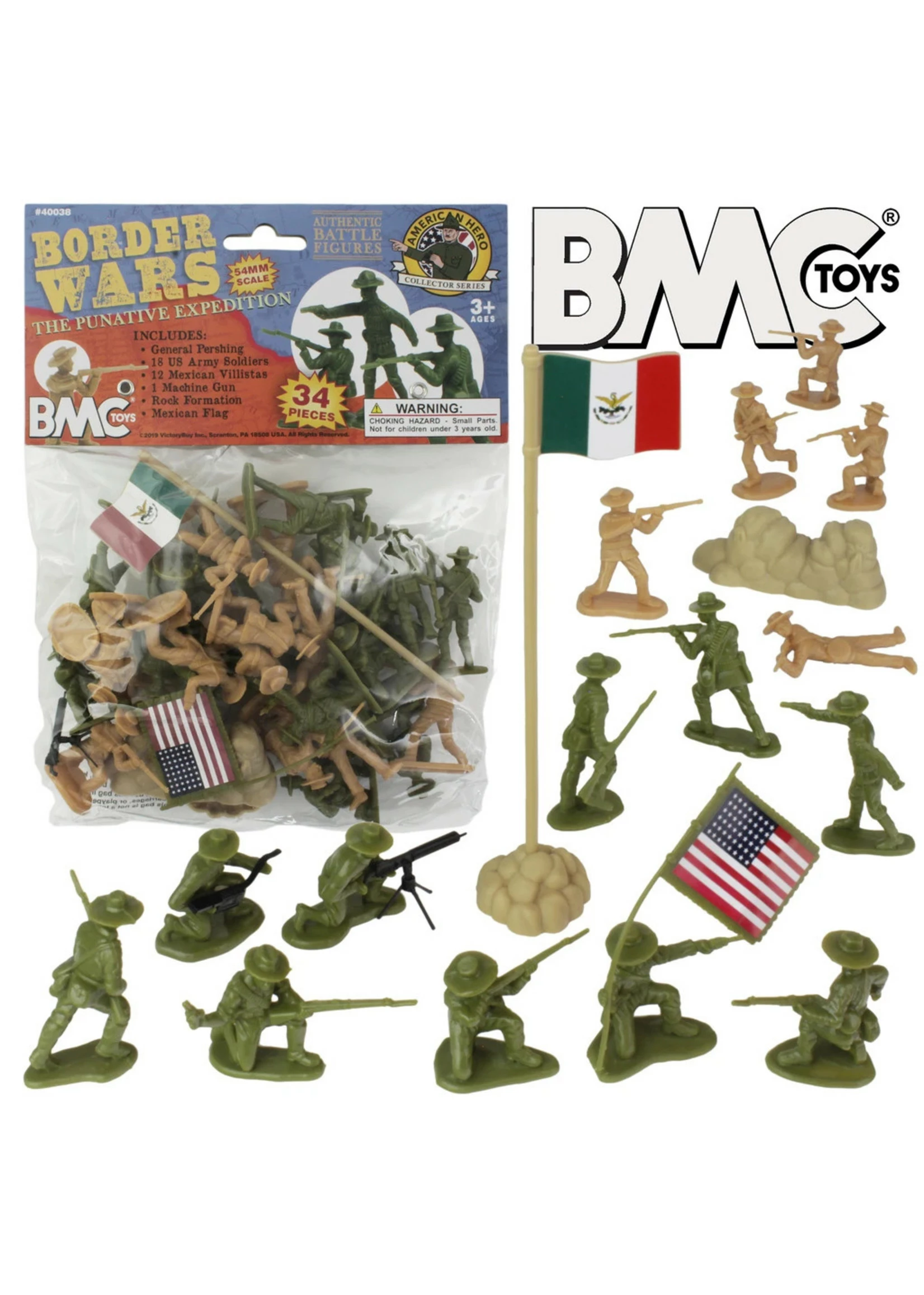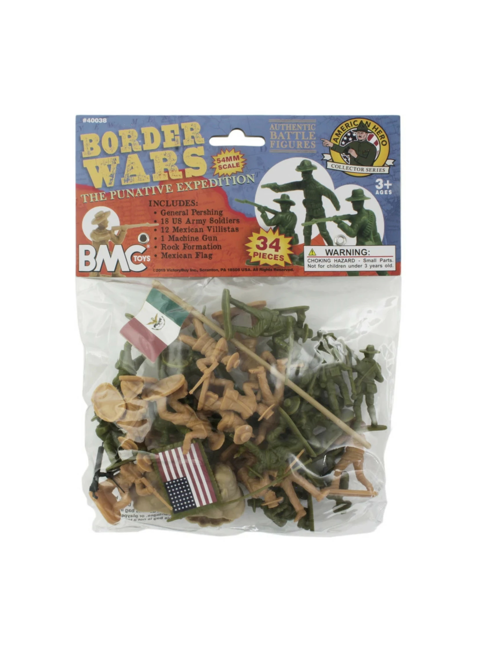 From the BMC Toys AMERICAN HERO COLLECTOR SERIES: Border Wars ‘The Punitive Expedition’ 34 piece plastic army men set features 19 different figures and includes General John J. Pershing, 18 US Army Soldiers in Olive Drab Green, 12 Mexican Villista Counter Revolutionaries in Medium Tan color, a machine gun and ammo, a desert rock, and the flag of Mexico.