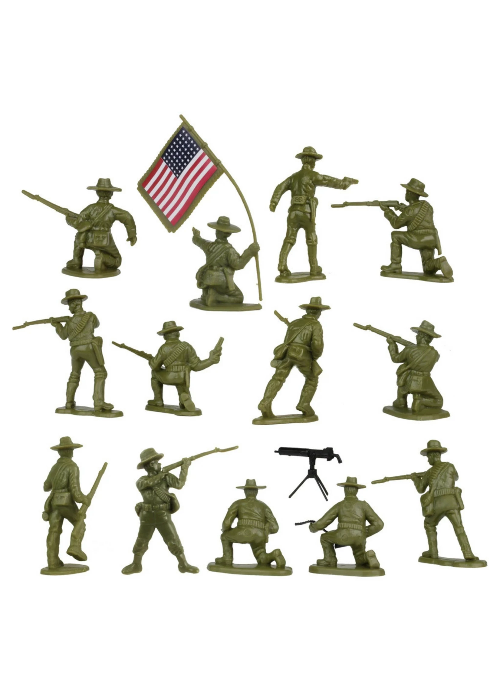 Made from fairly flexible LDPE plastic with medium detail and very little flashing, figures stand up to 2.25 inches tall and are about 1:32nd scale. Please note the pole for the US flag bearer doesn’t stand up straight due to the softer plastic used for this edition. These figures were first offered in 1999 as part of the BMC Toys THE ROUGH RIDERS CHARGE UP SAN JUAN HILL boxed playset and have not been produced in more than a decade. This new figure set features the further exploits of John Pershing, the Buffalo Soldiers, and the US Army during the Mexican Revolution at the sunset of the old west and dawn of the WW1 era.
