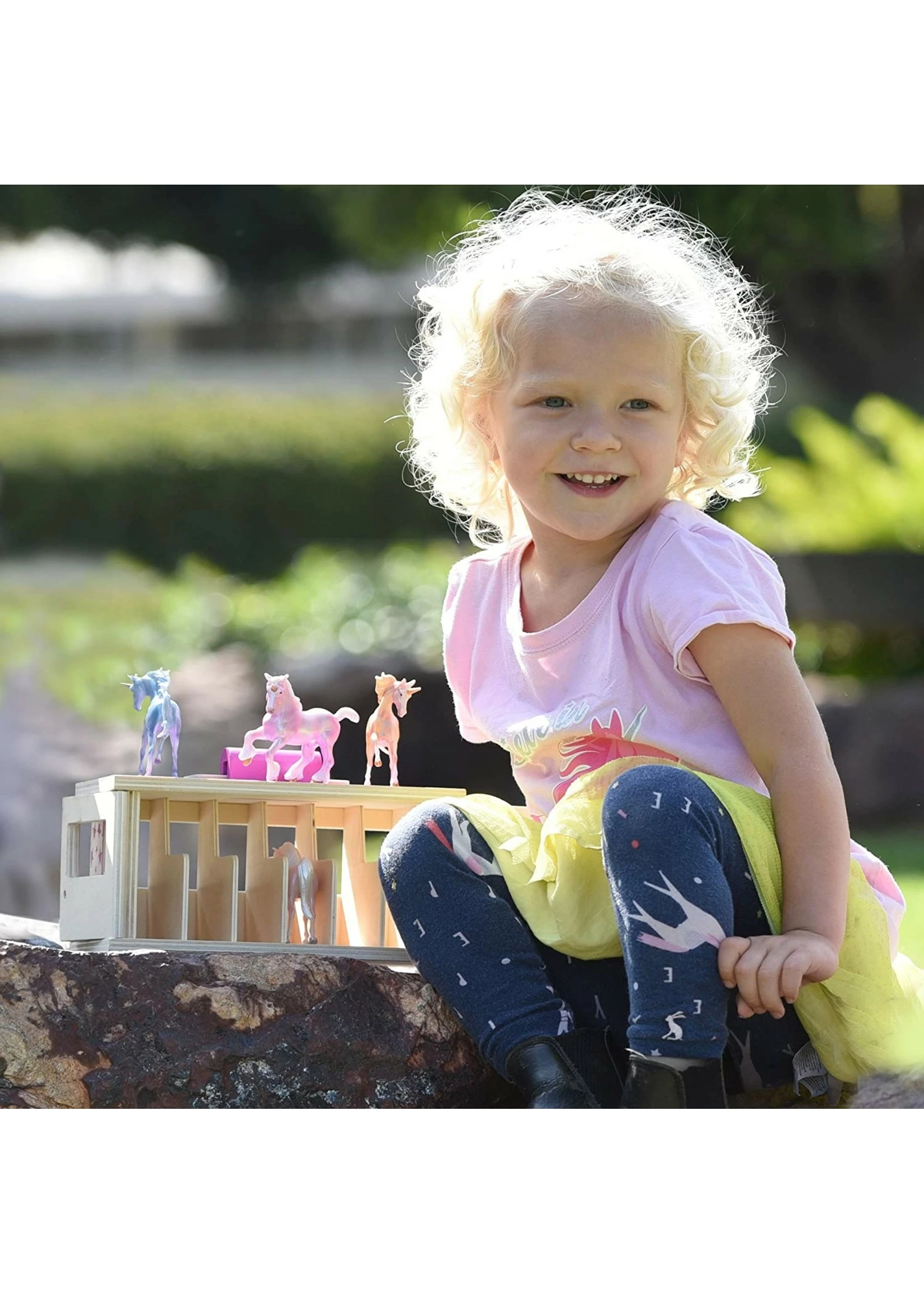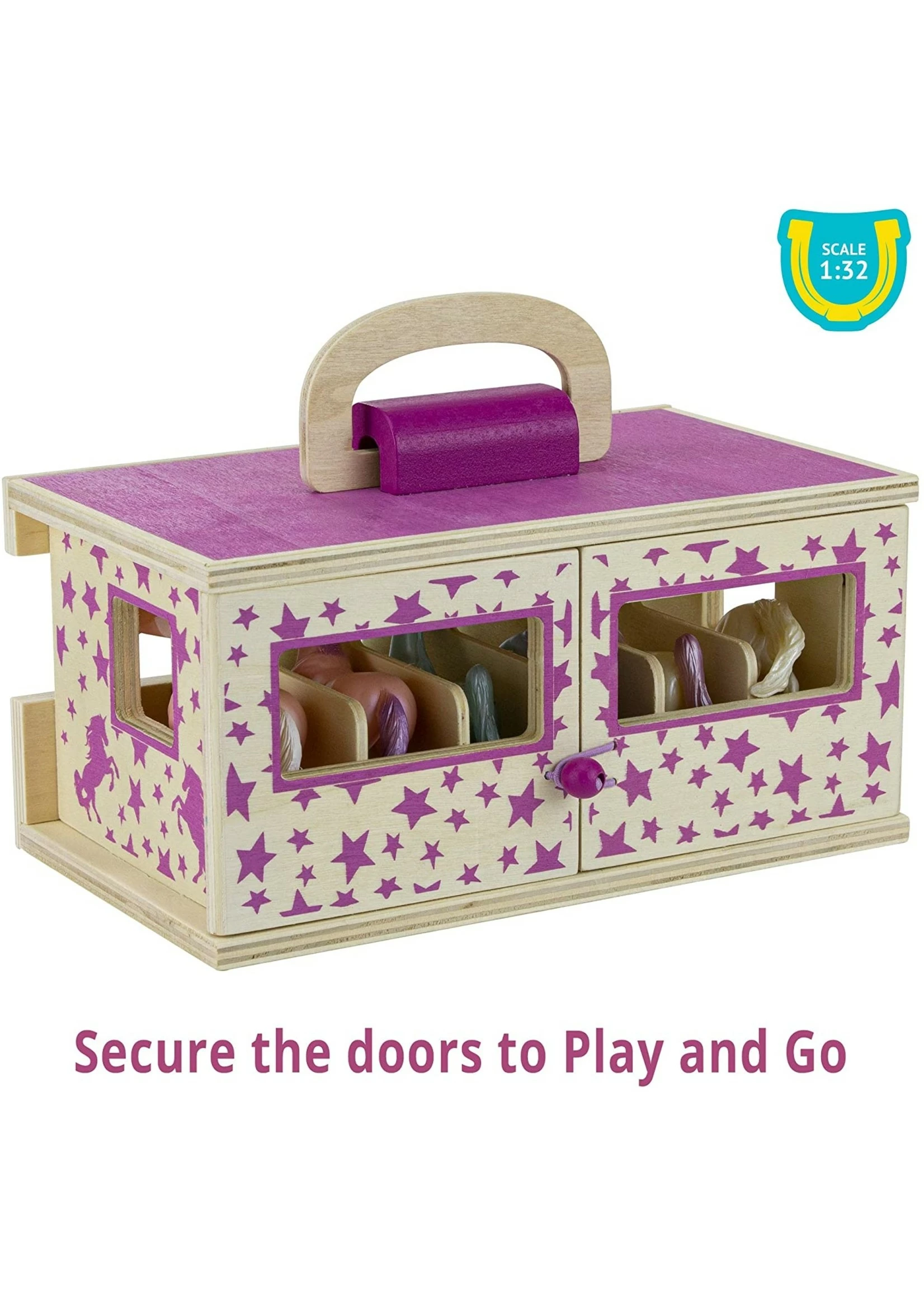 Breyer Farms Unicorn Magic Wooden Stable with carry handle – The Unicorn Magic Wooden Stable Playset comes complete with 6 Stablemates unicorns. Designed to be easy for small hands to carry, the wooden stable with carry handle makes the perfect take-along toy!