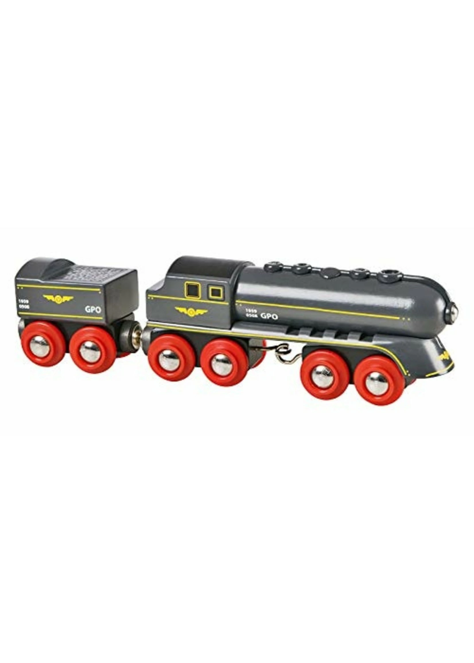 Get on, jump in and take off with this BRIO train. The speedy bullet train is steamed up and ready to go. The coal tender wagon is filled up and the engines running. Let’s go for a train ride.