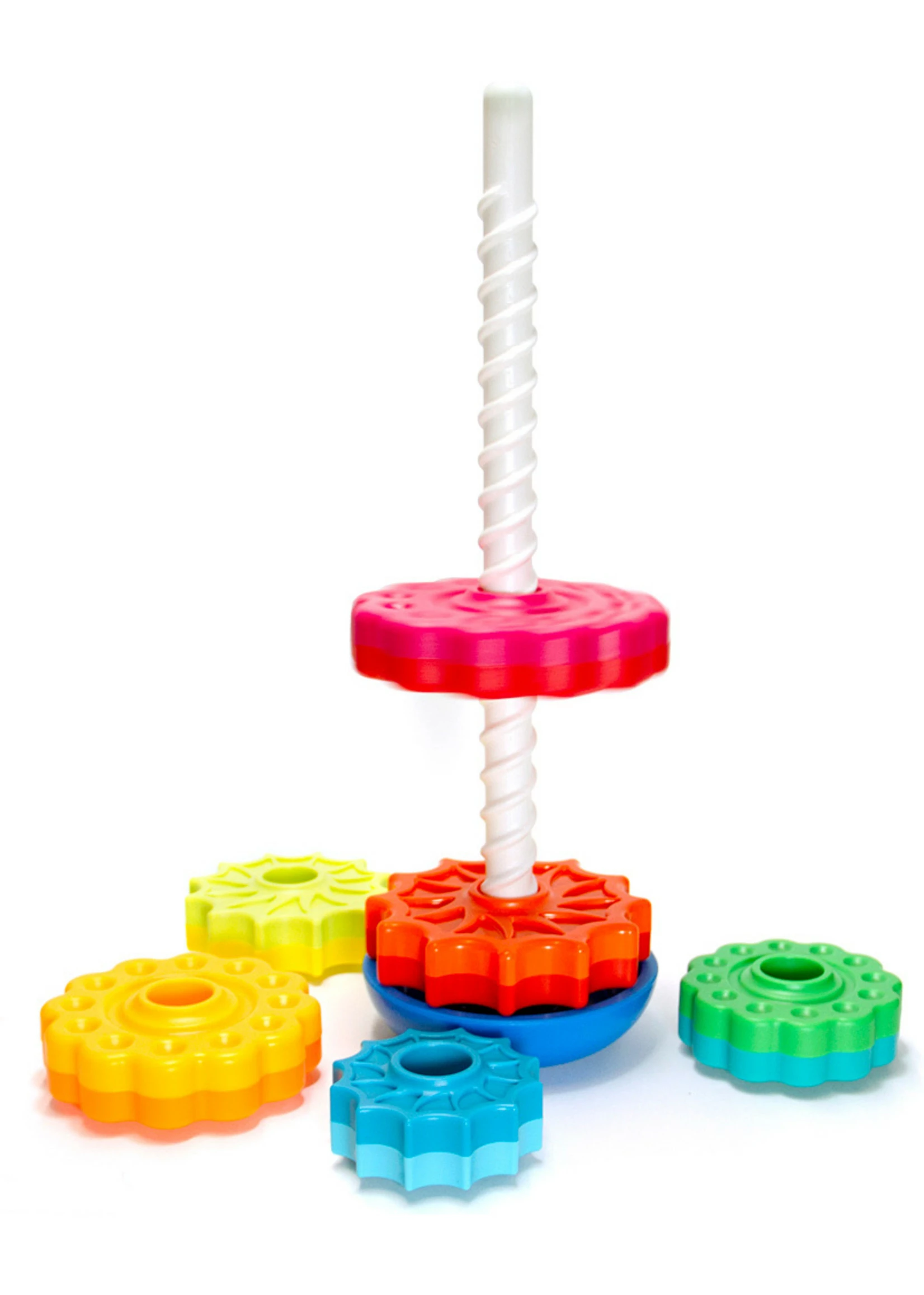 Set of 6 vibrant, graduated discs that spin down a corkscrew pole and stack up any way you want; discs alternate between flower and star-burst shapes, feature 2 colors each.