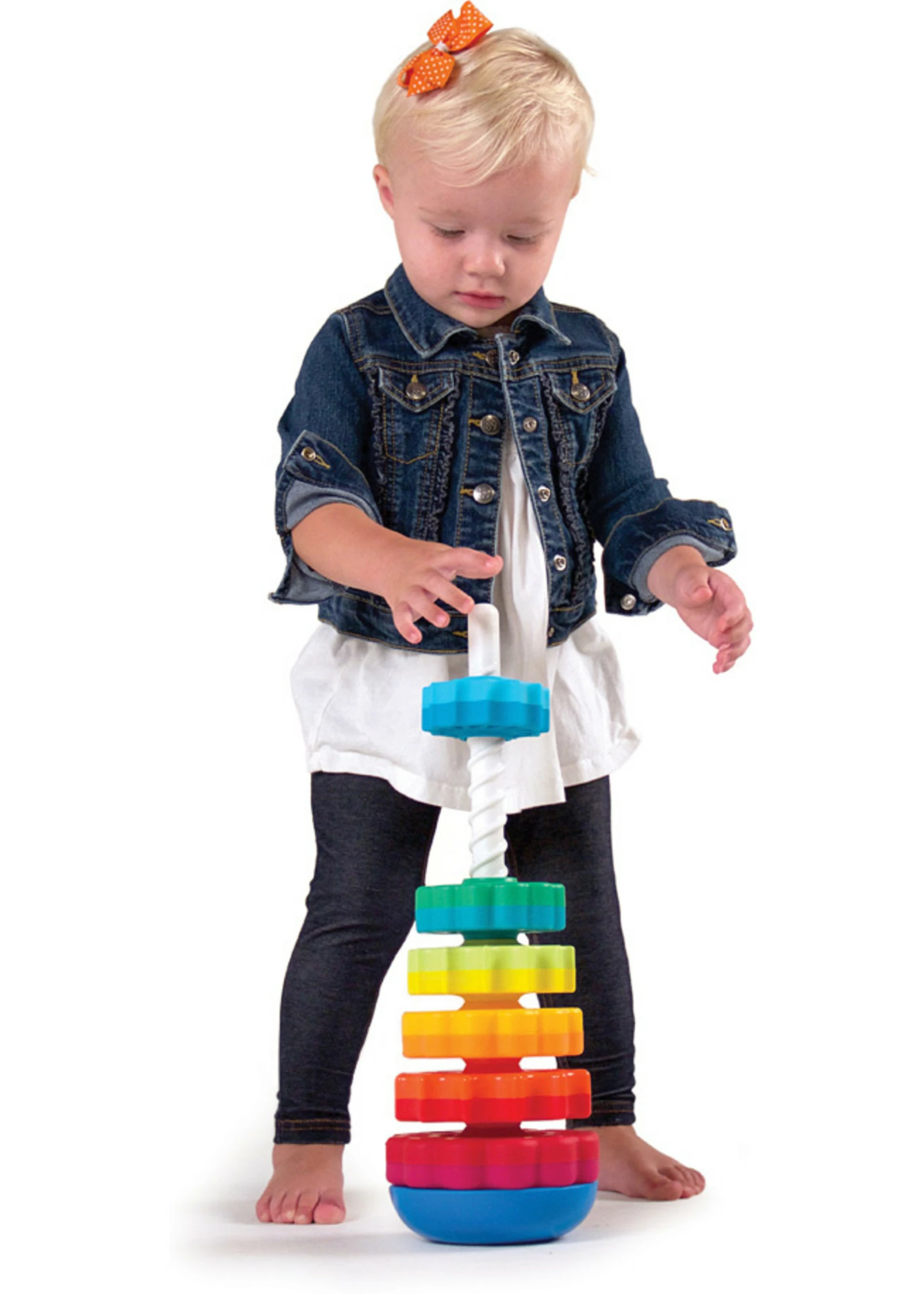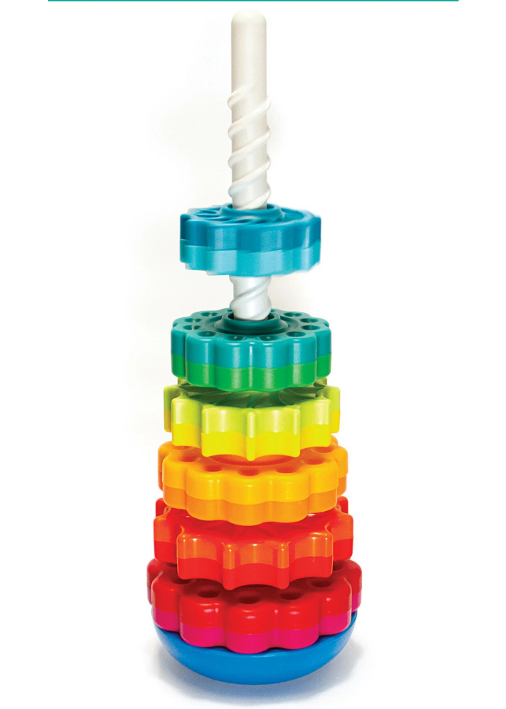 Pull the pole from the base to watch all the discs tumble to the ground; keep on spinning and stacking again and again; flip the base to choose either wobbly or sturdy; practice sorting discs by color, shape, and size.