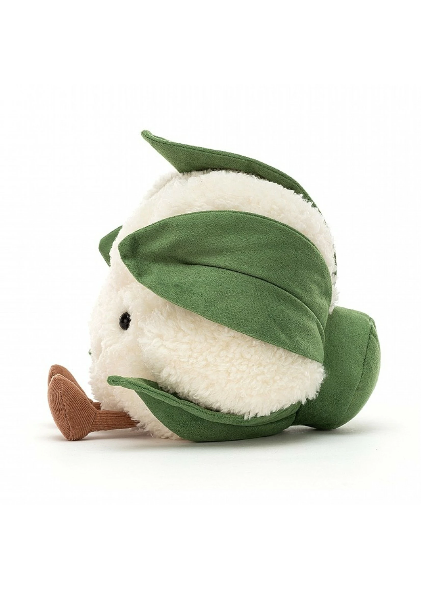 Rolling in from the sunny field, it’s Amuseable Cauliflower! This bobble of goodness has fleecy florets, a cheery smile and cordy booties! This veggie’s in vogue, with a funky jacket of foldy, suedey, stitchy leaves!