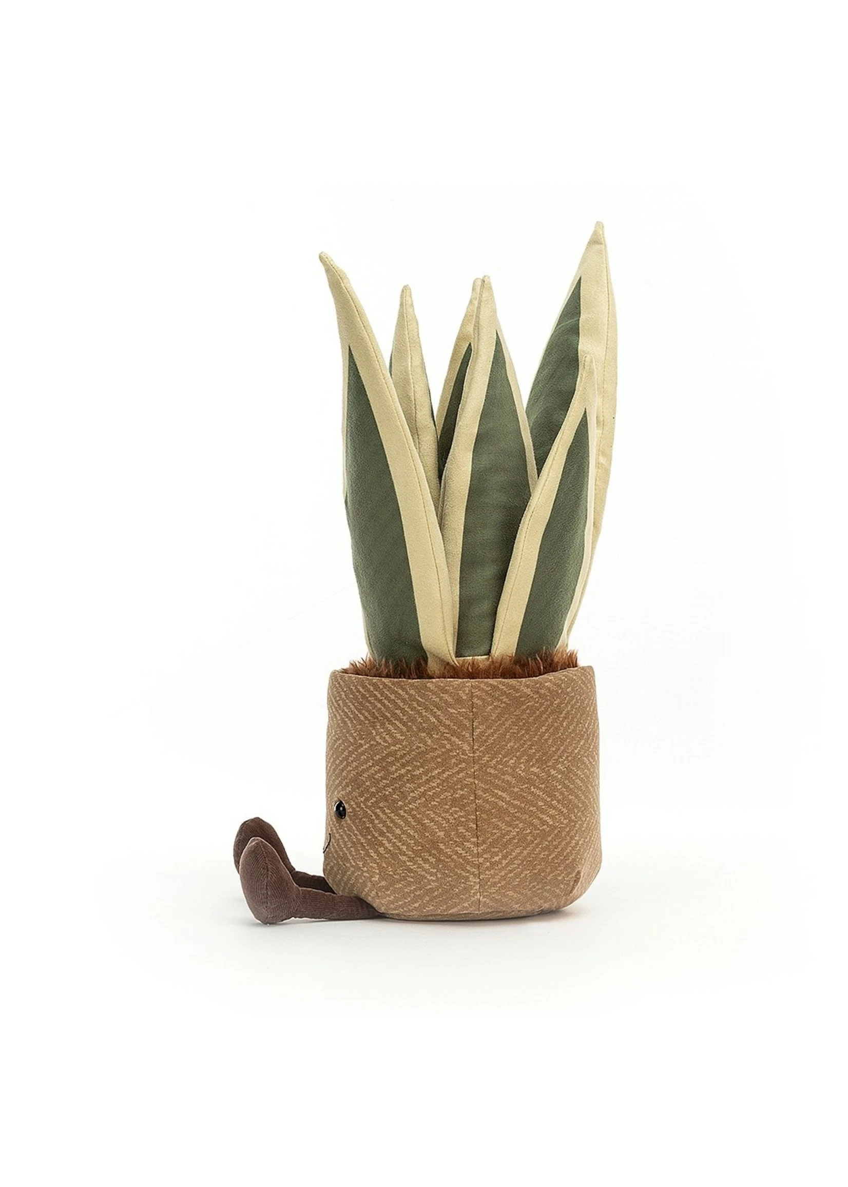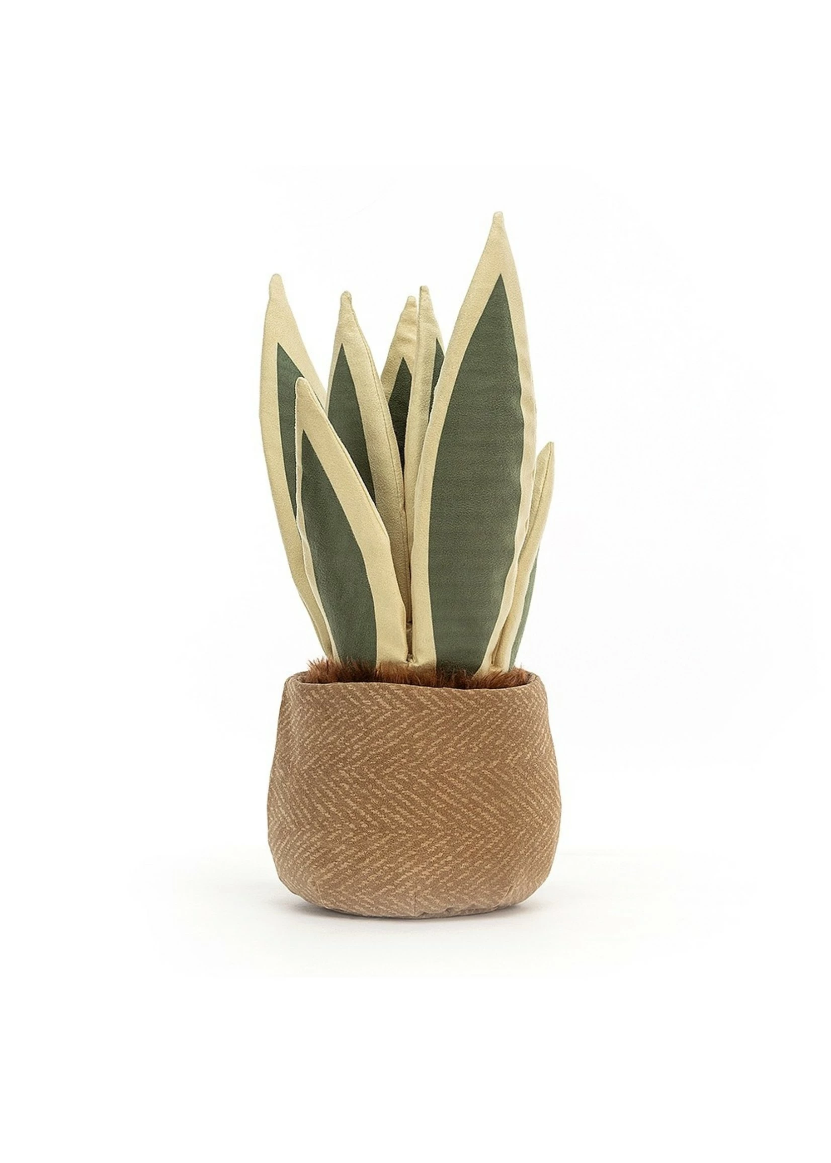 A cheeky workmate with a cheery grin, Amuseable Snake Plant is the office prankster. This spikey scamp has fuzzy soil, a gingery wicker-look pot and suedey green and cream leaves. With fuzzy soil and kicky cord feet, this snake plant’s a wriggly rascal.