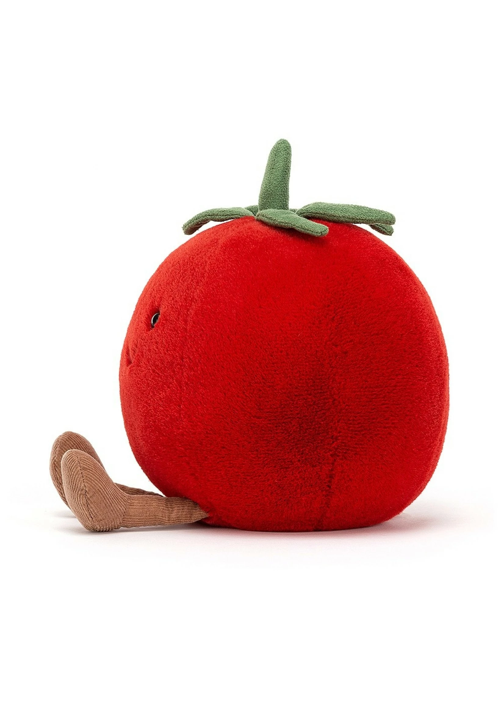 Amuseable Tomato is one sun-ripened rogue! Rosy and plump as a cricket ball, topped with a scruffly, leafy cap, this bright red bounder in toffee cord booties is equally at home in the kitchen or the garden. Anywhere where there’s sunlight, in fact!