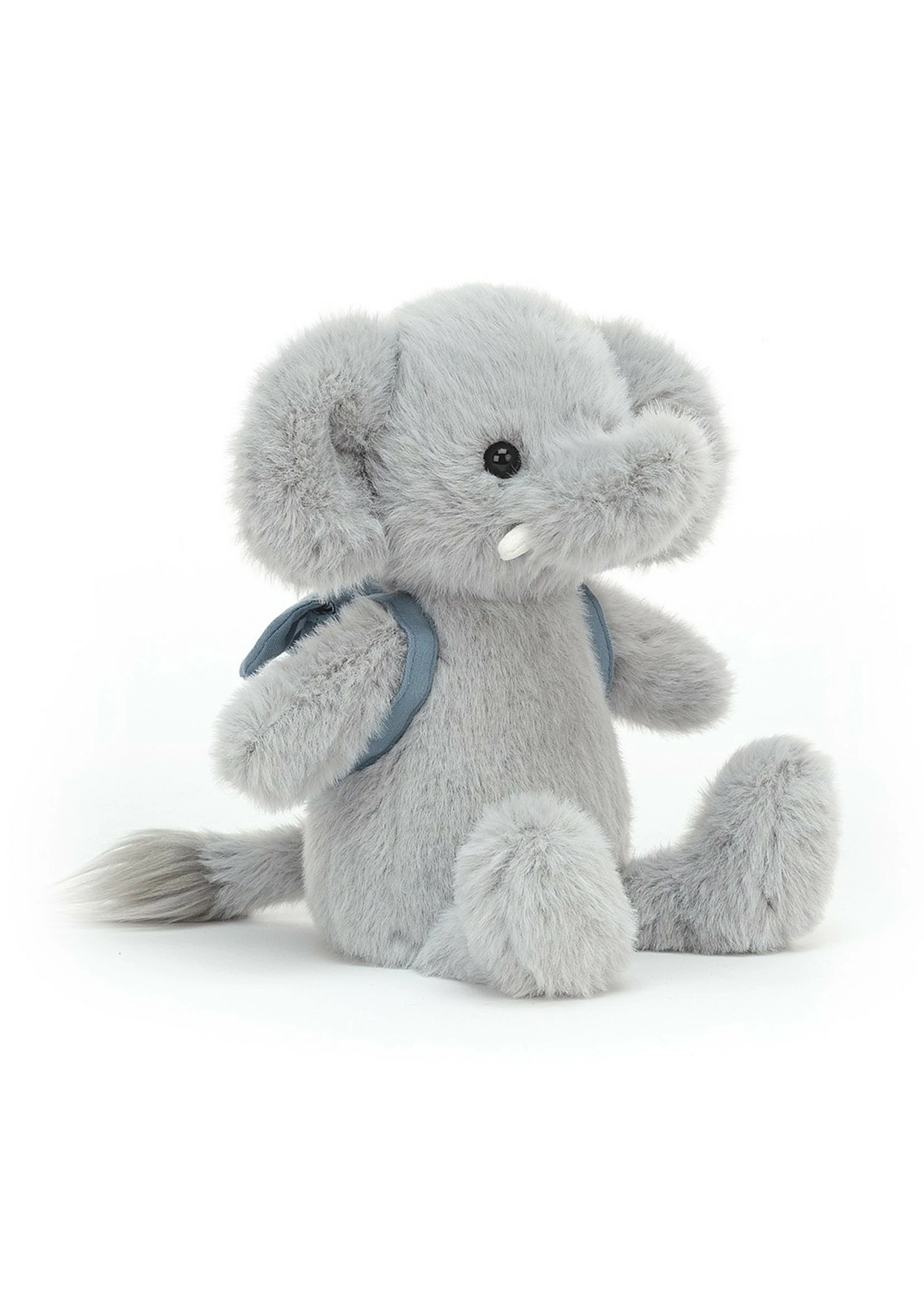 Backpack Elephant’s ready for the hike! This tusky, fuzzy grey pack-yderm hasn’t forgotten a single item, but needs to get a move on! With tufty tail, blue linen backpack and trunk raised quizzically, you can stomp out in style with this softy by your side!