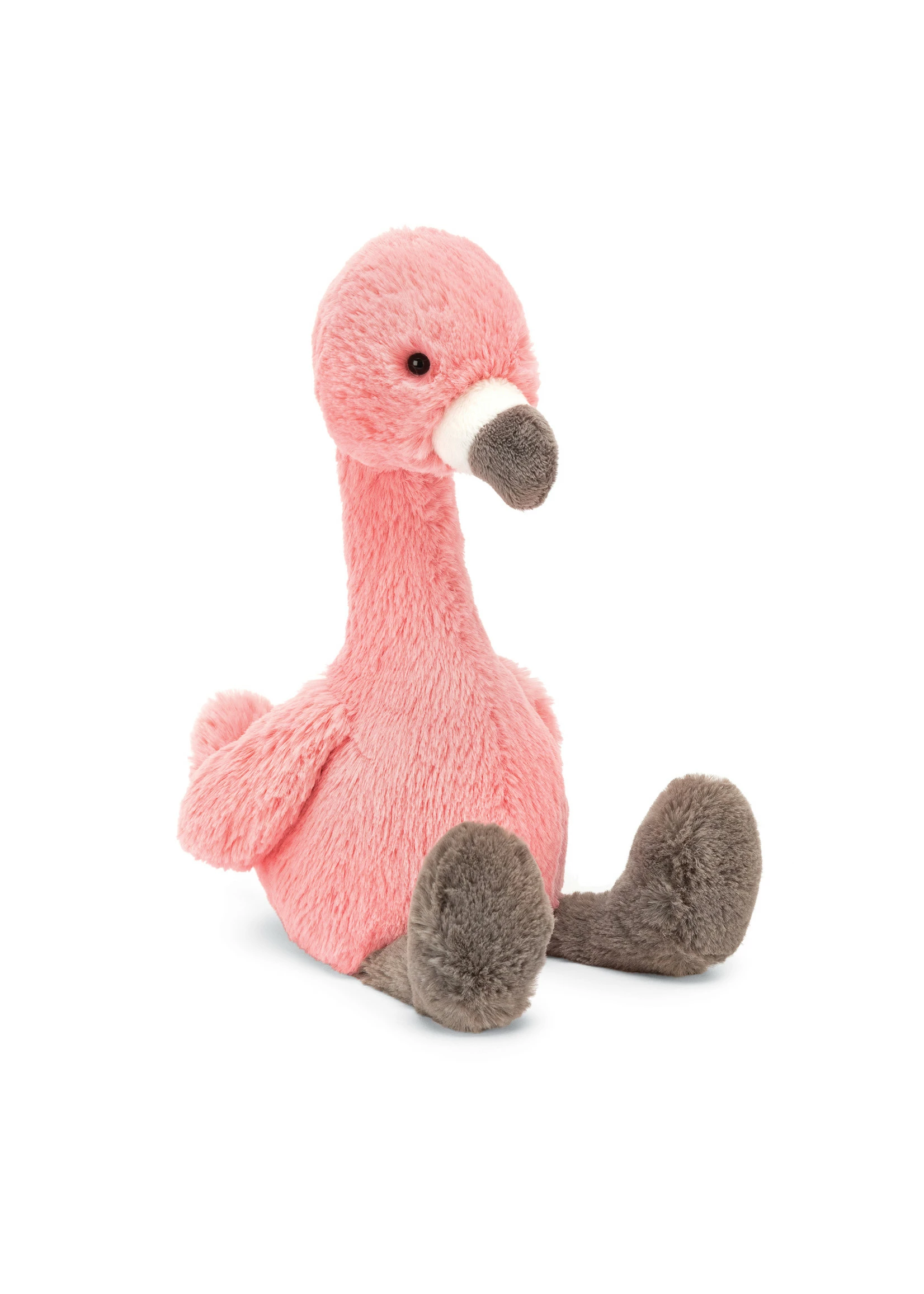 Bashful Flamingo is bubblegum-pink and a very good friend to babies and tots. This bonny bird is soft and squeezable, with a long, stand-up neck, tufty tail and nuzzly mocha feet and beak. Take this winged wonder to the park or the pond and watch the world flap by.