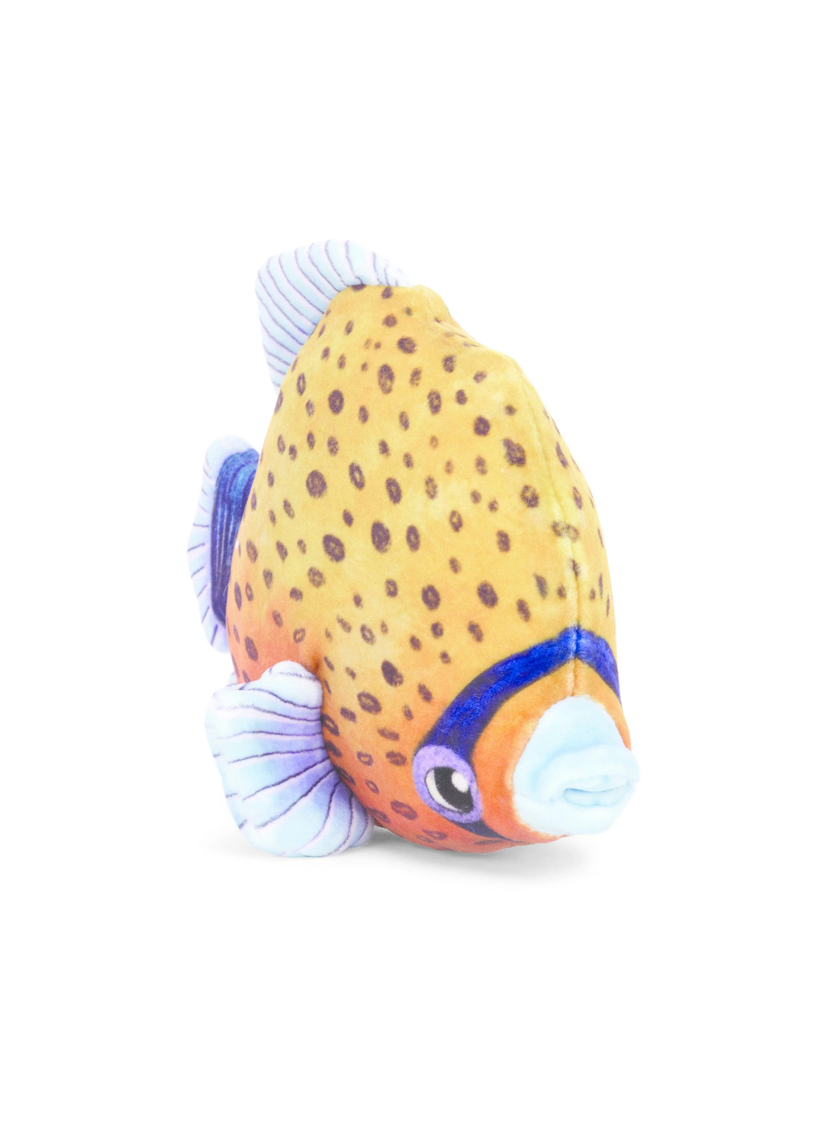 Fishiful Orange is a riot of colour with stretchy-soft printed fur! Zany and zingy, this funky fish has cocoa freckles, ombre orange sides and baby-blue lips, with a bold navy eye band and multicoloured fins! Dreamy-eyed and perfect for drifting off with.