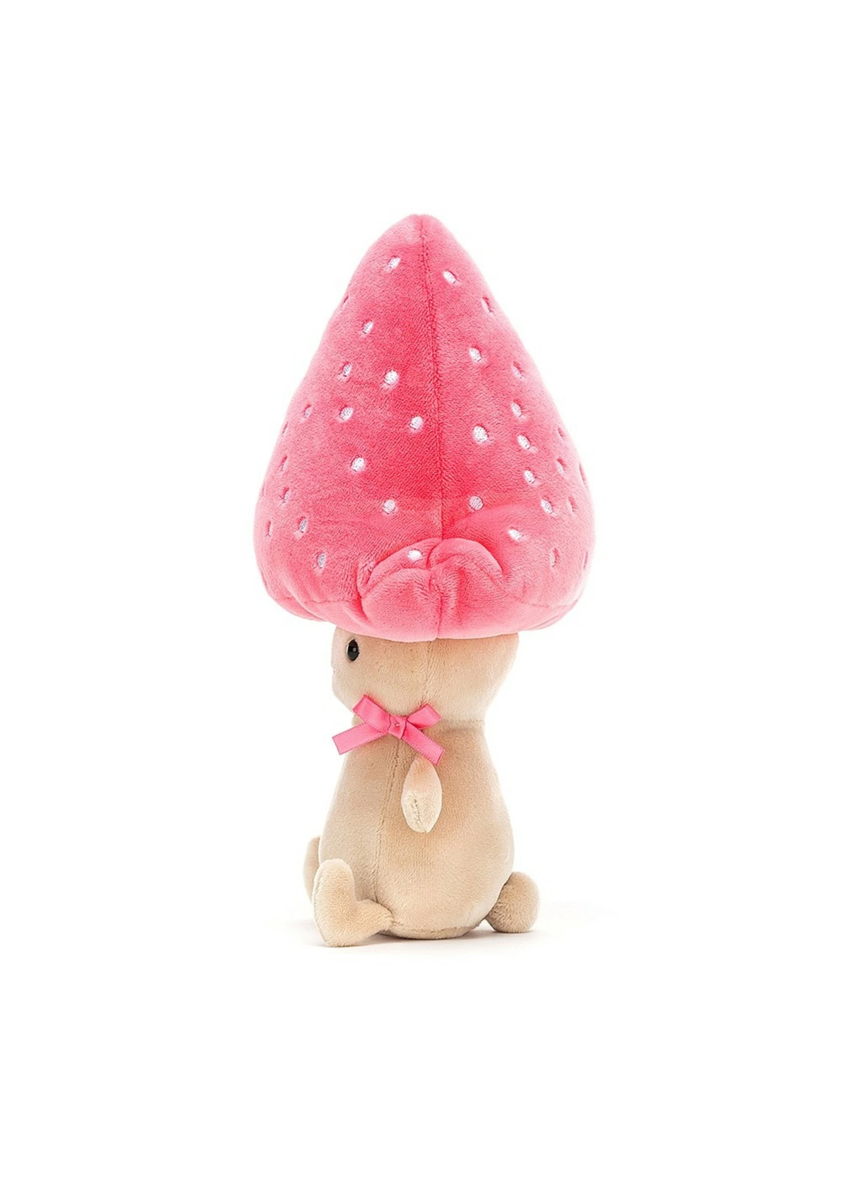 Fancy Fun-Guy Pattie is sure to perk anyone’s spirits up! Sitting proud beneath a big bubblegum hat with embroidered freckles, and sporting a smart satin bow, Pattie is one spiffy woodland dweller – usually found hogging the shady spots!
