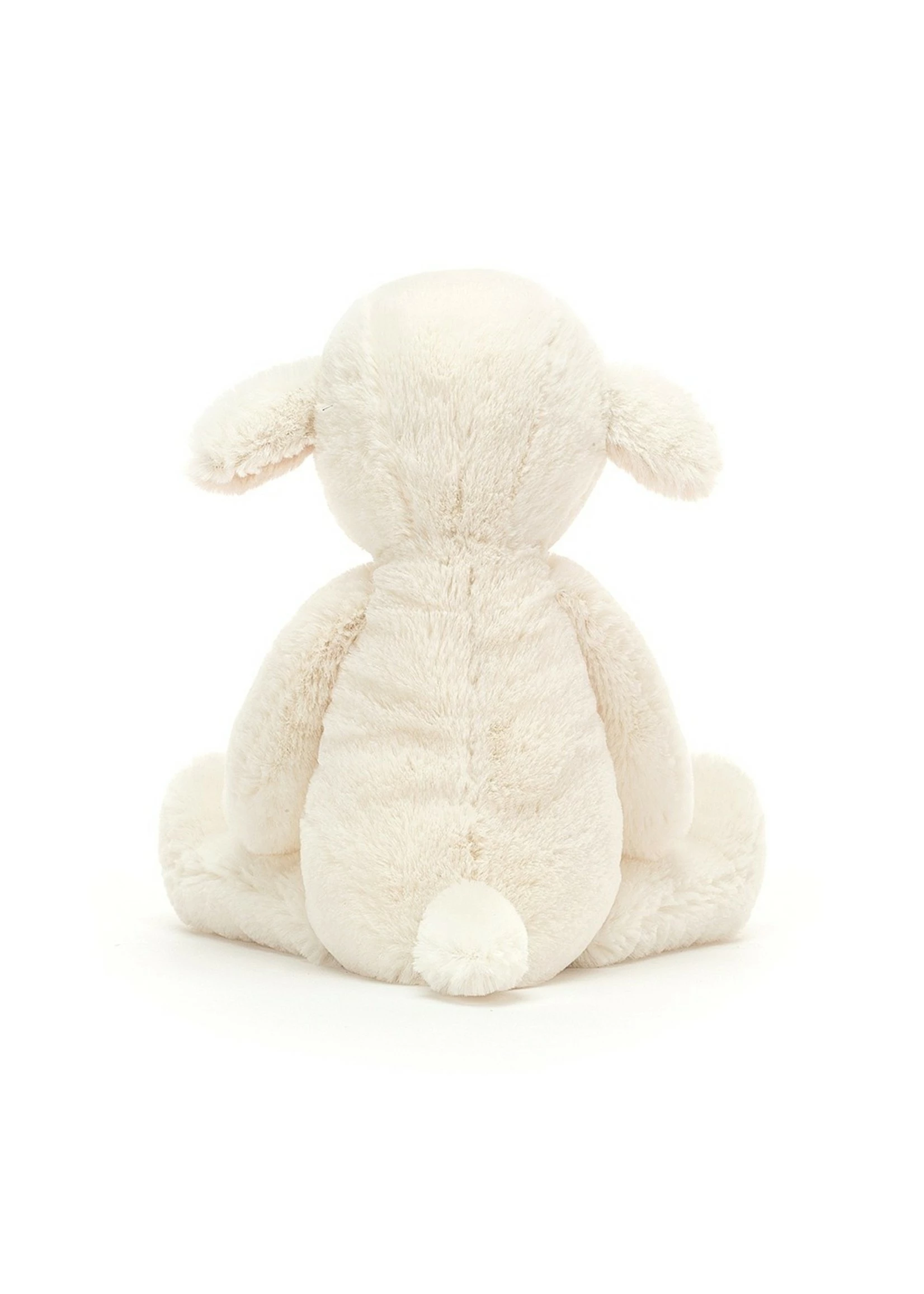 Bramwell Lamb is so, so gentle, with a creamy marshmallow fleece. This lopsy lamb has foldy petal ears, baby-soft hooves and a biscuity face. With a stitchy nose and scrumbly tummy, Bramwell’s a beautiful bedtime buddy.