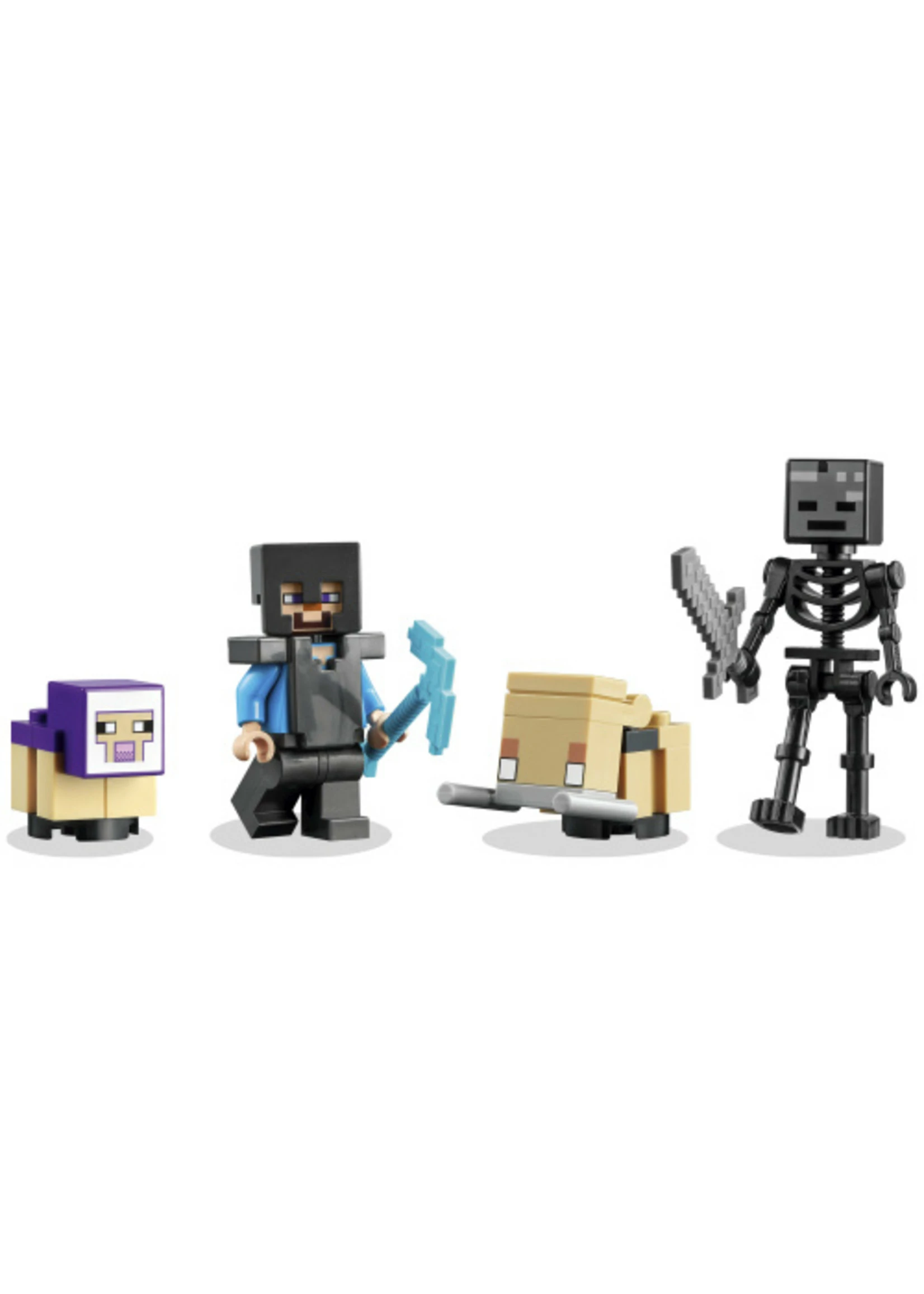 - The set features popular Minecraft™ character Steve plus familiar figures – a baby sheep, baby hoglin and a wither skeleton – and a buildable portal with hand-activated operation.