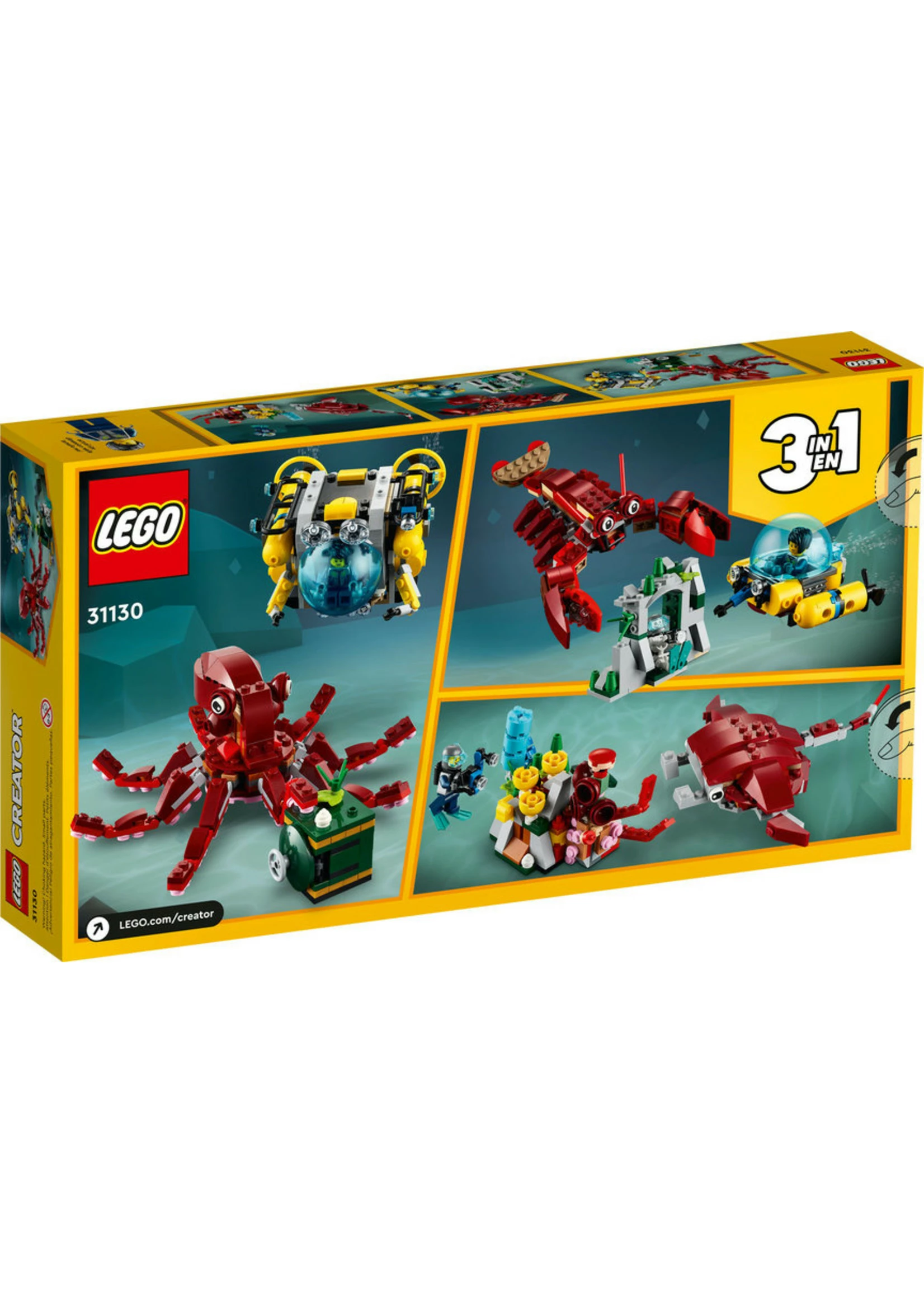 - 3in1 toy – Little builders can enjoy nonstop creative fun with the LEGO® Creator 3in1 Sunken Treasure Mission (31130), featuring 3 models in 1: an octopus, a giant lobster and a giant manta ray