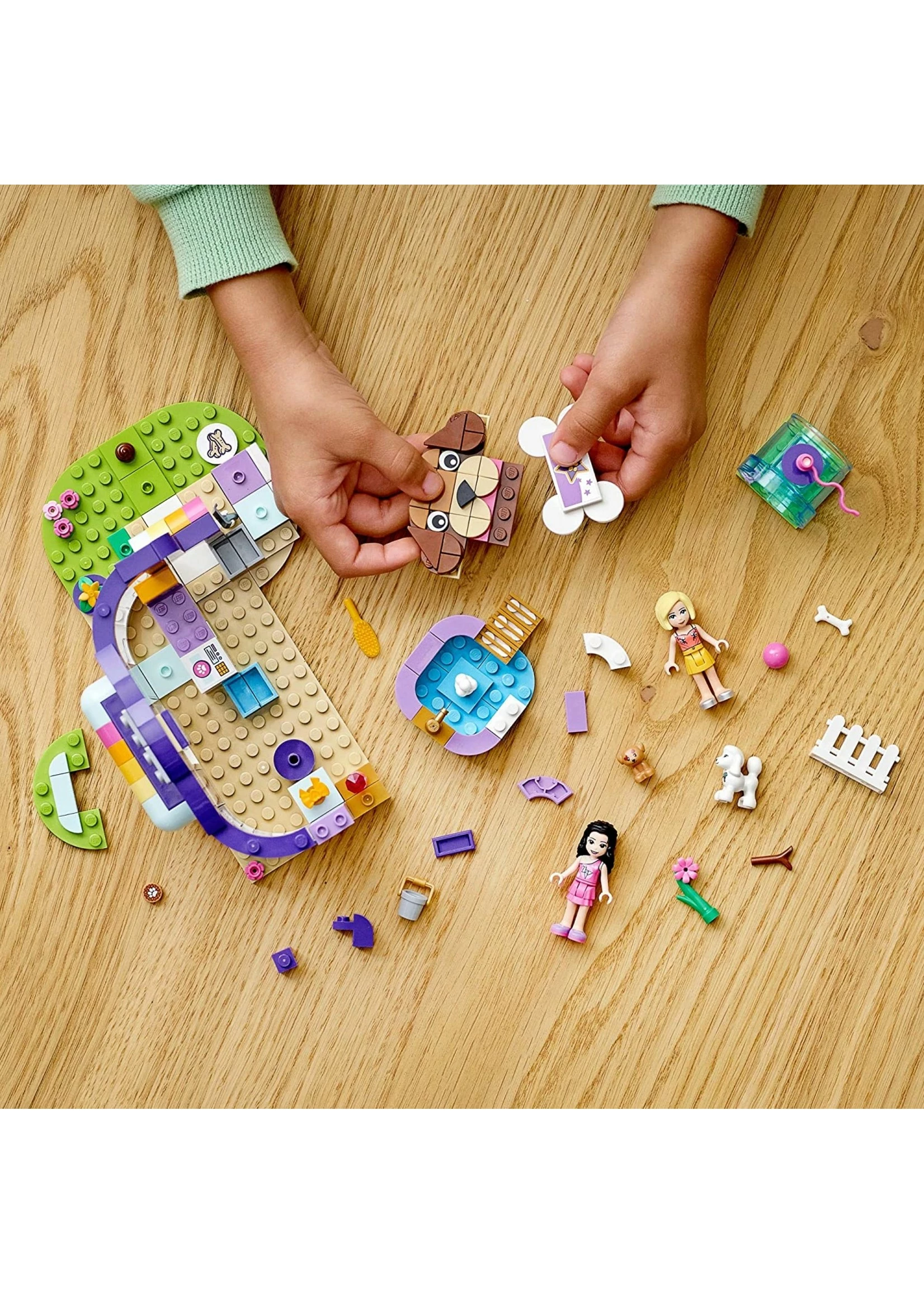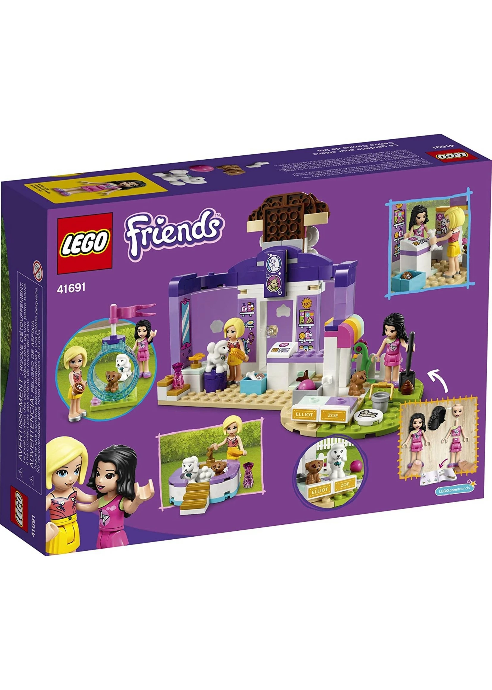 - Includes LEGO® Friends Emma and Roxy mini-dolls, a dog figure and a new-for-January-2021 puppy figure. Also comes with a grooming area, cash register, separate bathing pool and agility tunnel.