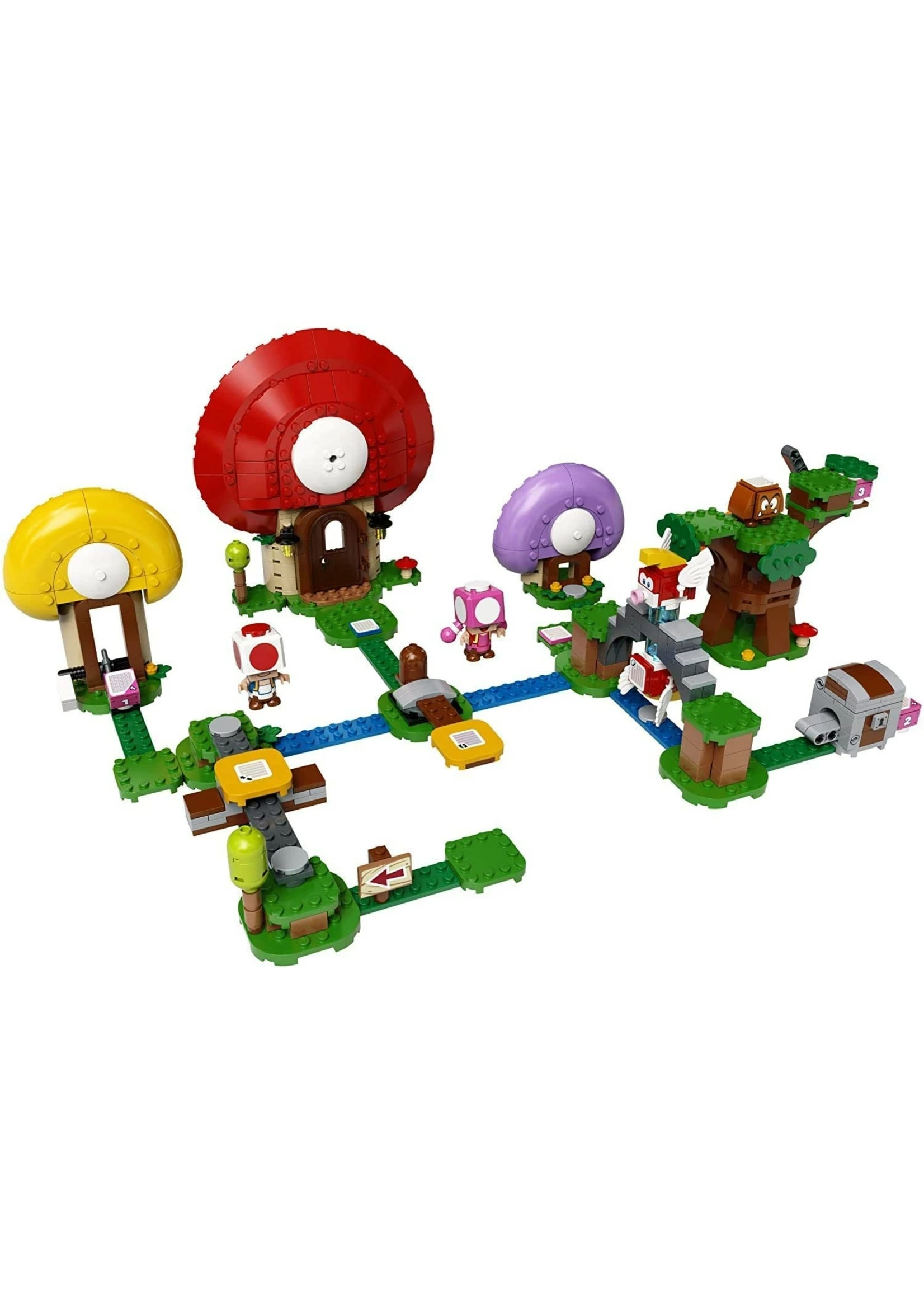 - This LEGO® Super Mario™ toy playset features Toad Houses, a tree, treasure chest, sliding and rotating platforms and 10 action bricks, plus a Goomba, 2 Cheep Cheeps and Toad and Toadette figures for hours of gameplay.