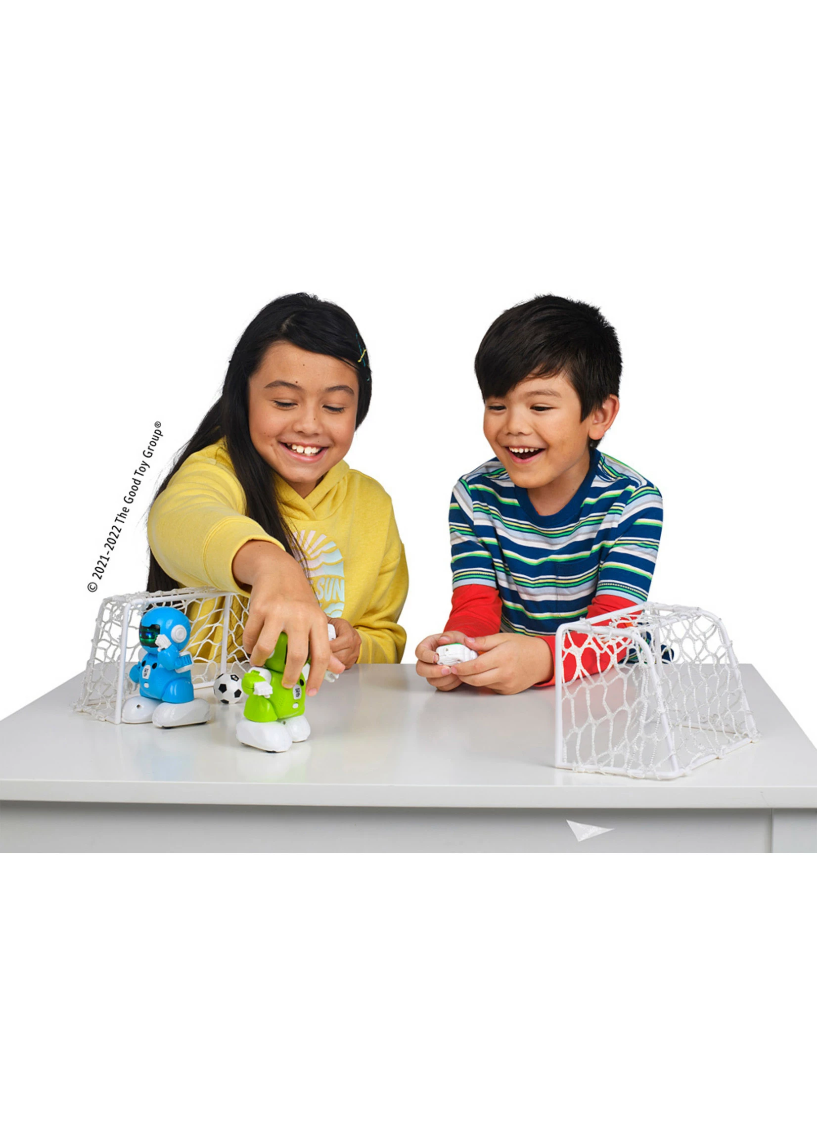 Perfect for kids who love robots and sports! These competitive opponents are under your remote control as they run, spin, dribble, score, and celebrate! Or sing and dance when you press the demo button – hilarity will be part of the match. Includes 2 intelligent robots with detachable USB rechargeable remotes, soccer ball, 2 goal nets and 2 USB cords. Cell batteries included.