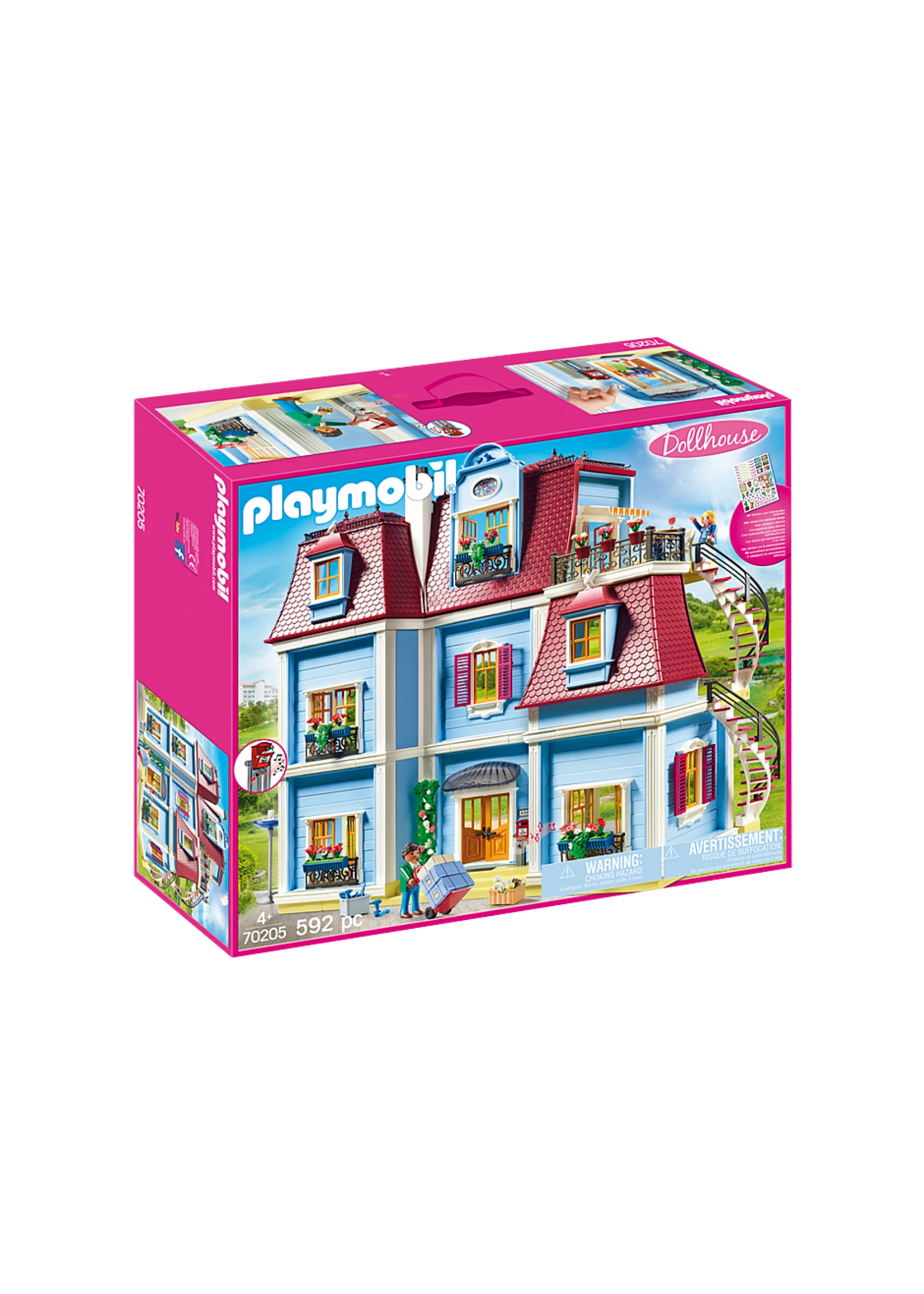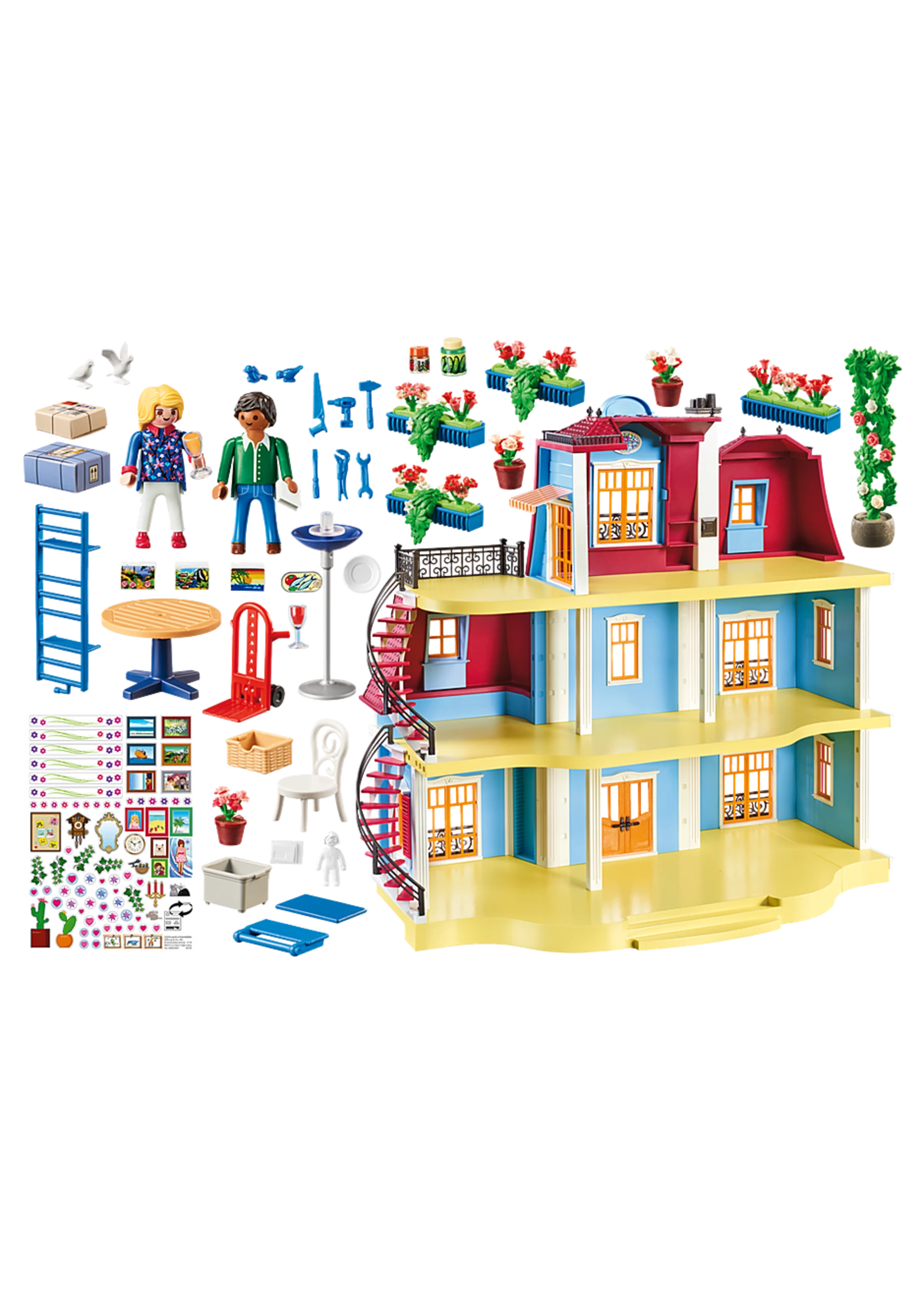 Welcome to your new home at the Large Dollhouse. Climb the spiral staircase to reach the second floor with many spacious rooms, or to go up to the rooftop terrace where you can sit at the table and look at the city from above. Listen for the functioning doorbell to know when you have visitors. It could be a delivery of packages or even a fresh bouquet of flowers! Add your own personal touches to the home with the included removable stickers and window boxes.