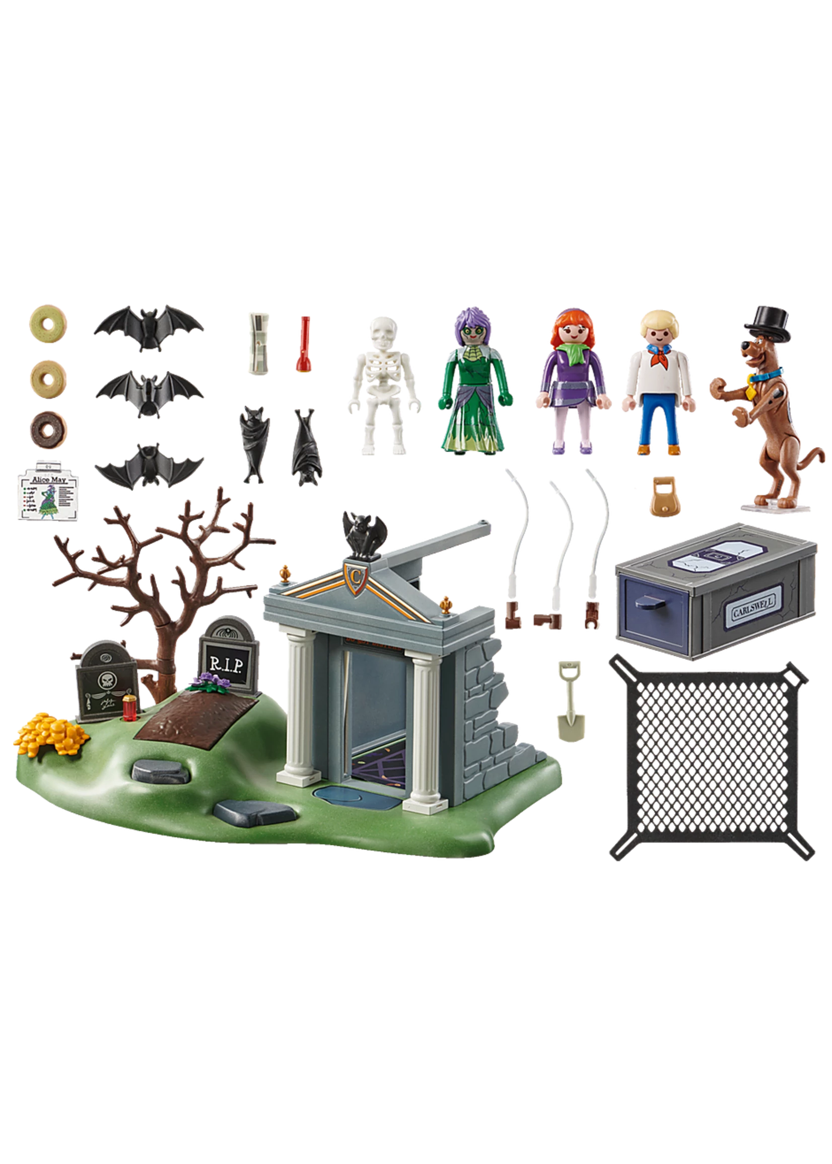 Accessories: 1 floor slab with tree, plant and path stones; 1 cathedral with 2 stone slabs at the entrance and gargoyle; 2 gravestones; 1 grave slab; 1 grave light; 1 grave earth with flowers; 1 catch net; 1 magic coffin; 1 shovel; 1 flashlight; 3 donuts; 1 bag; 1 ghost card; 1 cylinder; 1 dog collar; 1 dog tag; 1 stand for Scooby-Doo; 1 two-piece skirt; 1 collar; 1 collar; 2 holders for hanging bats