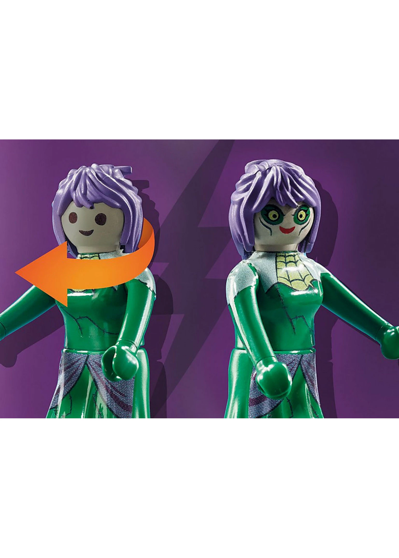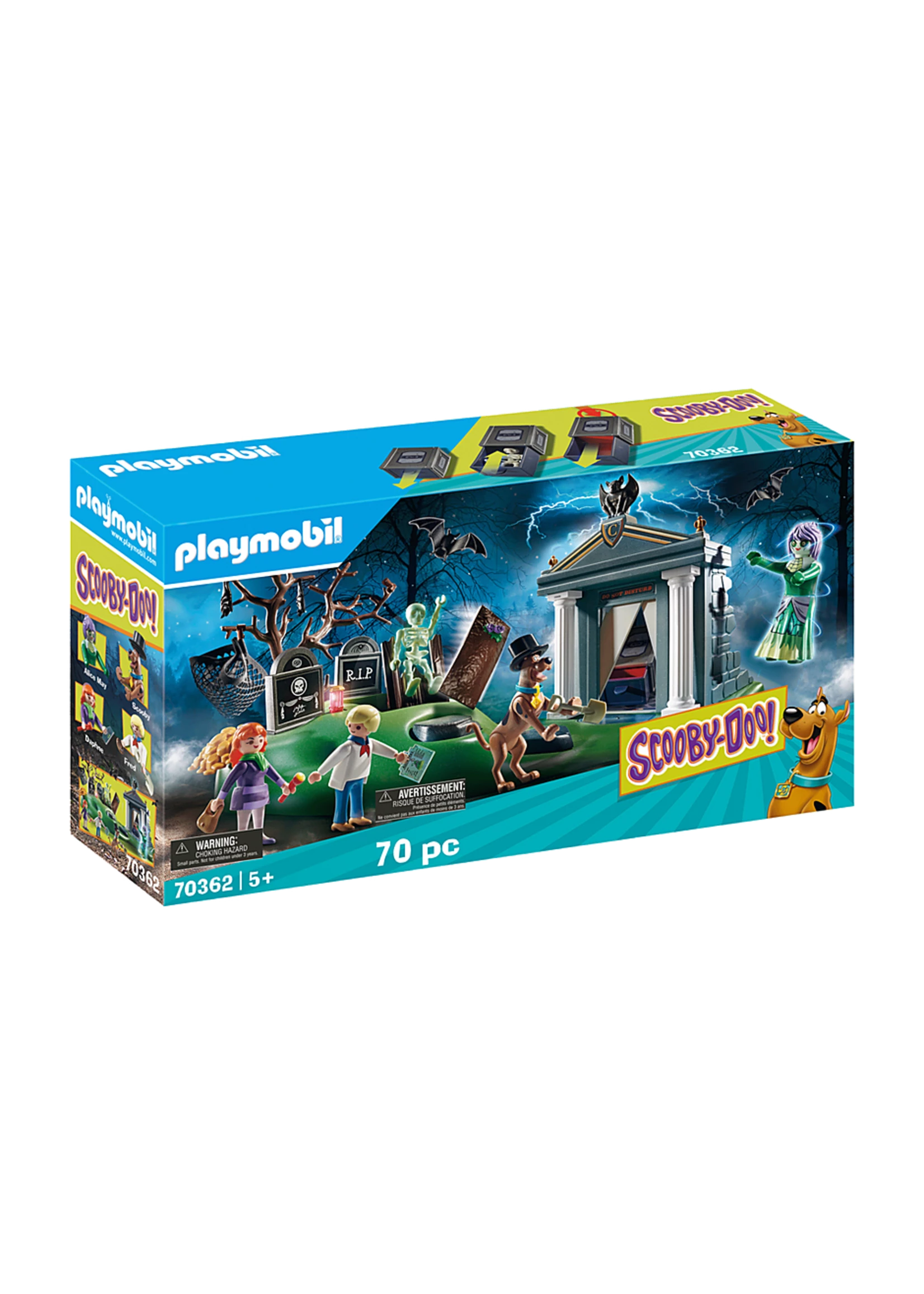 Scooby-Doo™, Fred™ & Daphne™ found themselves with a ghostly mystery to solve in the Cemetery. Lurking in this burial ground are some spooky surprises. As the gang walks by, a creepy skeleton pops out of the ground (just press the candle next to the grave), giving the gang a shock. The skeleton also glows in the dark for even more scary playtime encounters! Then, beware the mysterious coffin where figures disappear inside! The gargoyle above the entrance of the burial vault acts as a secret lever to release the stone slabs and block those looking to enter…or escape. The included ghost card will help you track down your ghost, and then use the net to capture her. Then, don’t let the ghost’s changing face fool you! Unmask her to reveal the real villain – Alice May!