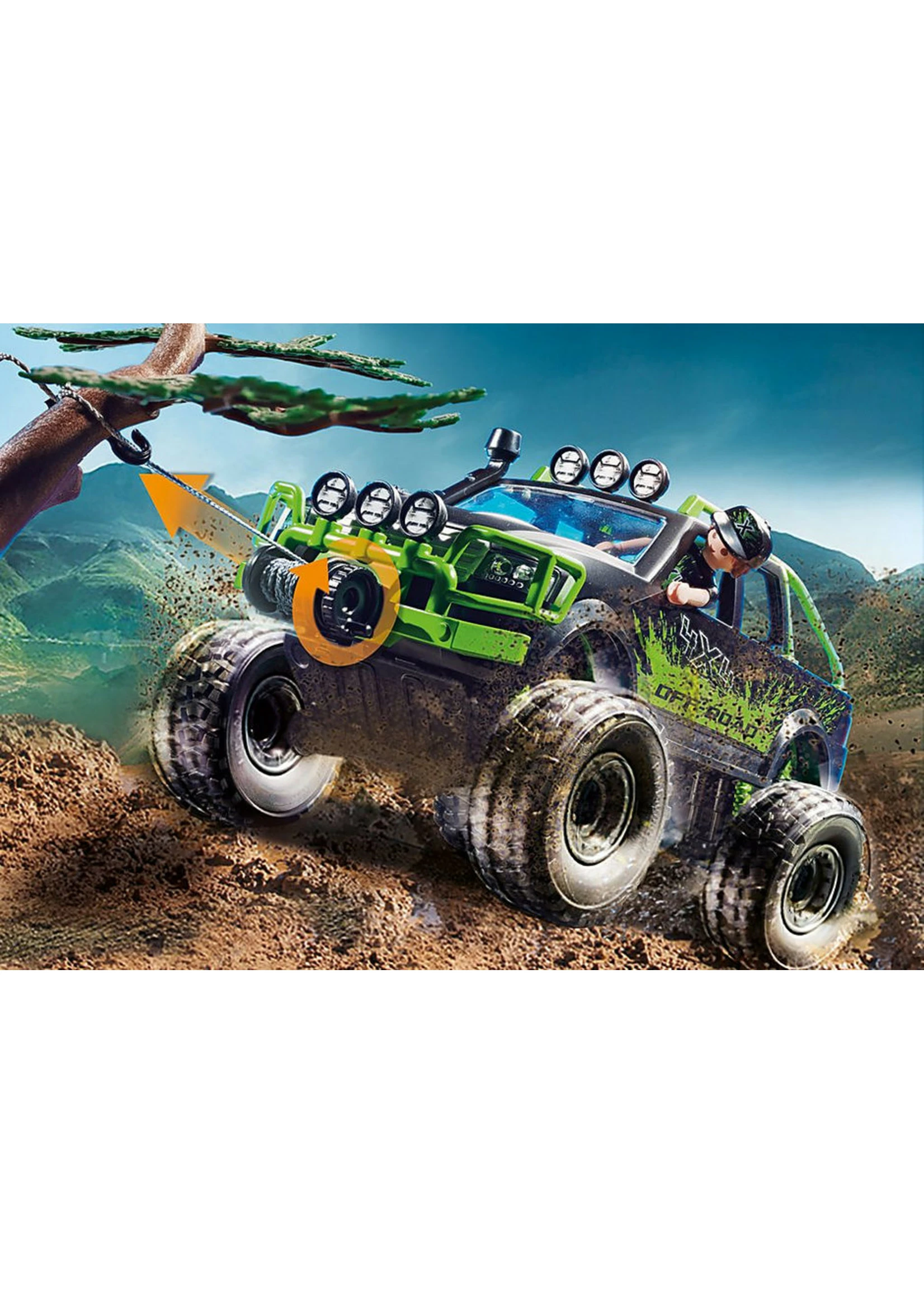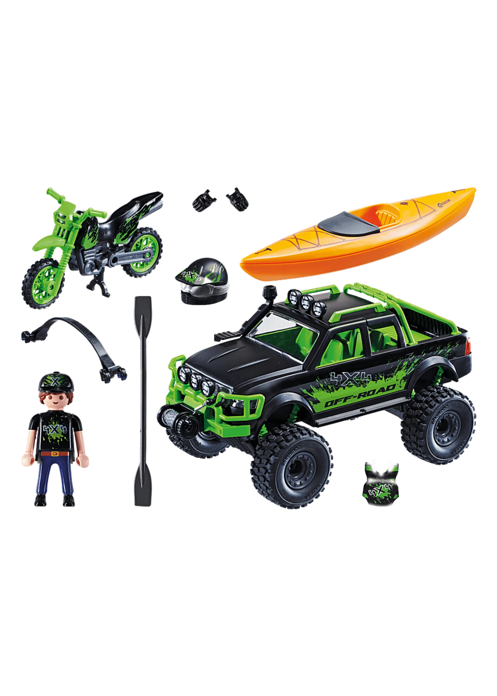 Accessories: 1 jeep, 1 motorcycle, 1 helmet, 1 canoe, 1 paddle, 2 gloves, 1 protective vest, 2 holding ropes