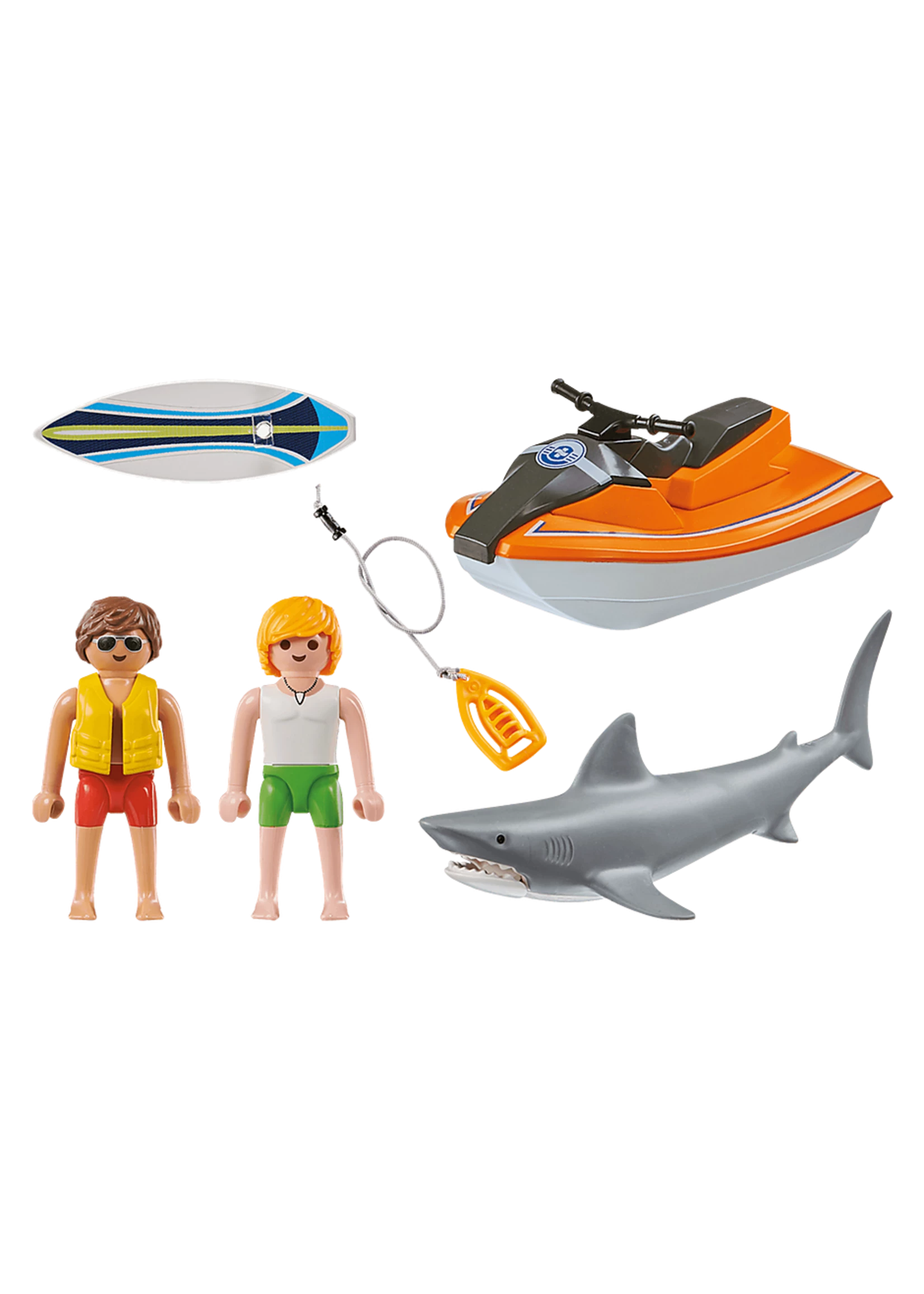 Includes: two figures, floating shark, floatation device, personal watercraft, and other accessories.