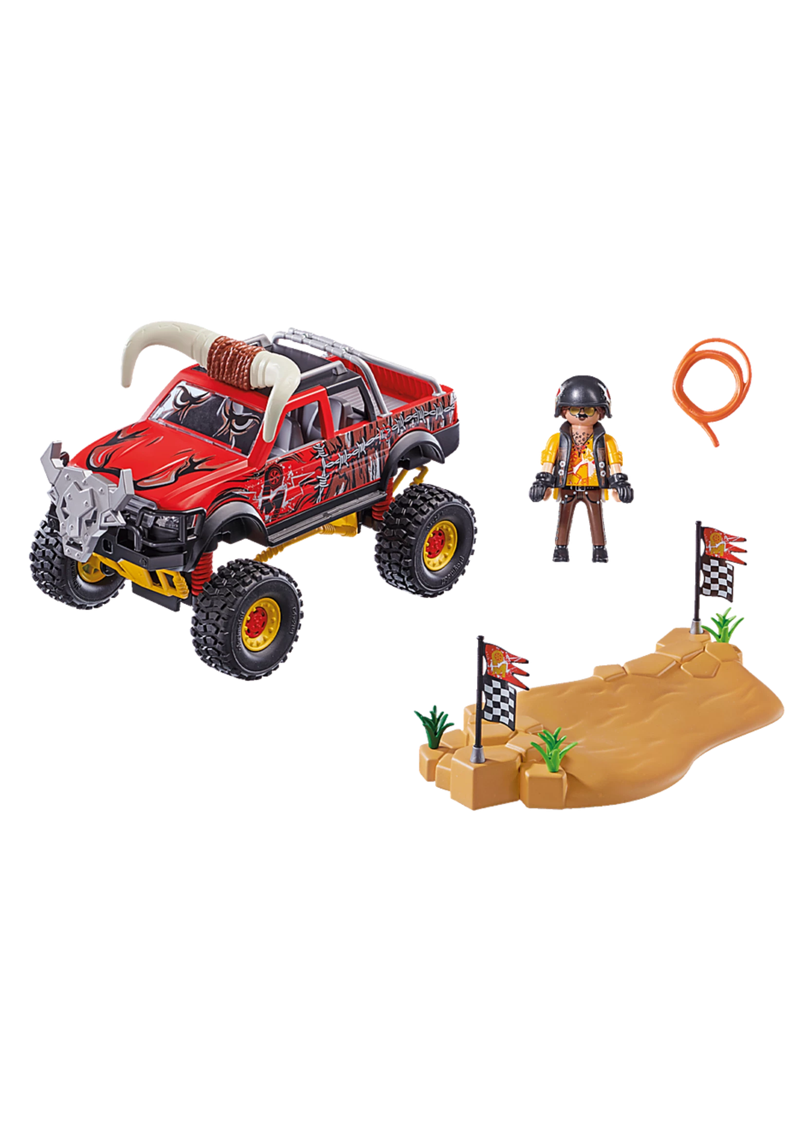 The Stunt Show Monster Truck Horned by PLAYMOBIL will make the hearts of all stunt action fans beat faster! With its wild barbed wire pattern, bull horns on the roof and a bull’s head on the radiator grille, the Monster Truck Horned lives up to its name. With its sprung axles and four spring-mounted tires, the Monster Truck easily overcomes any obstacle. Even the sand hill is no problem for the brave driver in his brawny truck. Great fun for brave children! The set includes a PLAYMOBIL figure, a monster truck, a sand hill obstacle, a finish flag and many other extras.