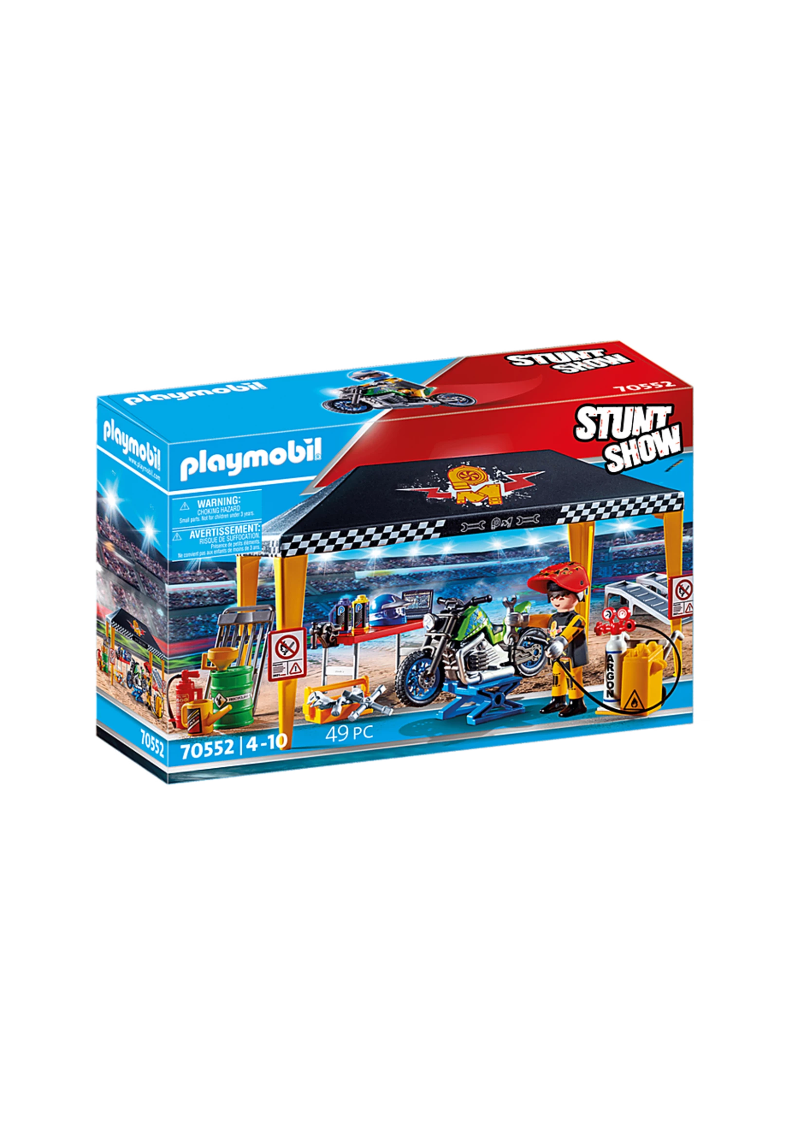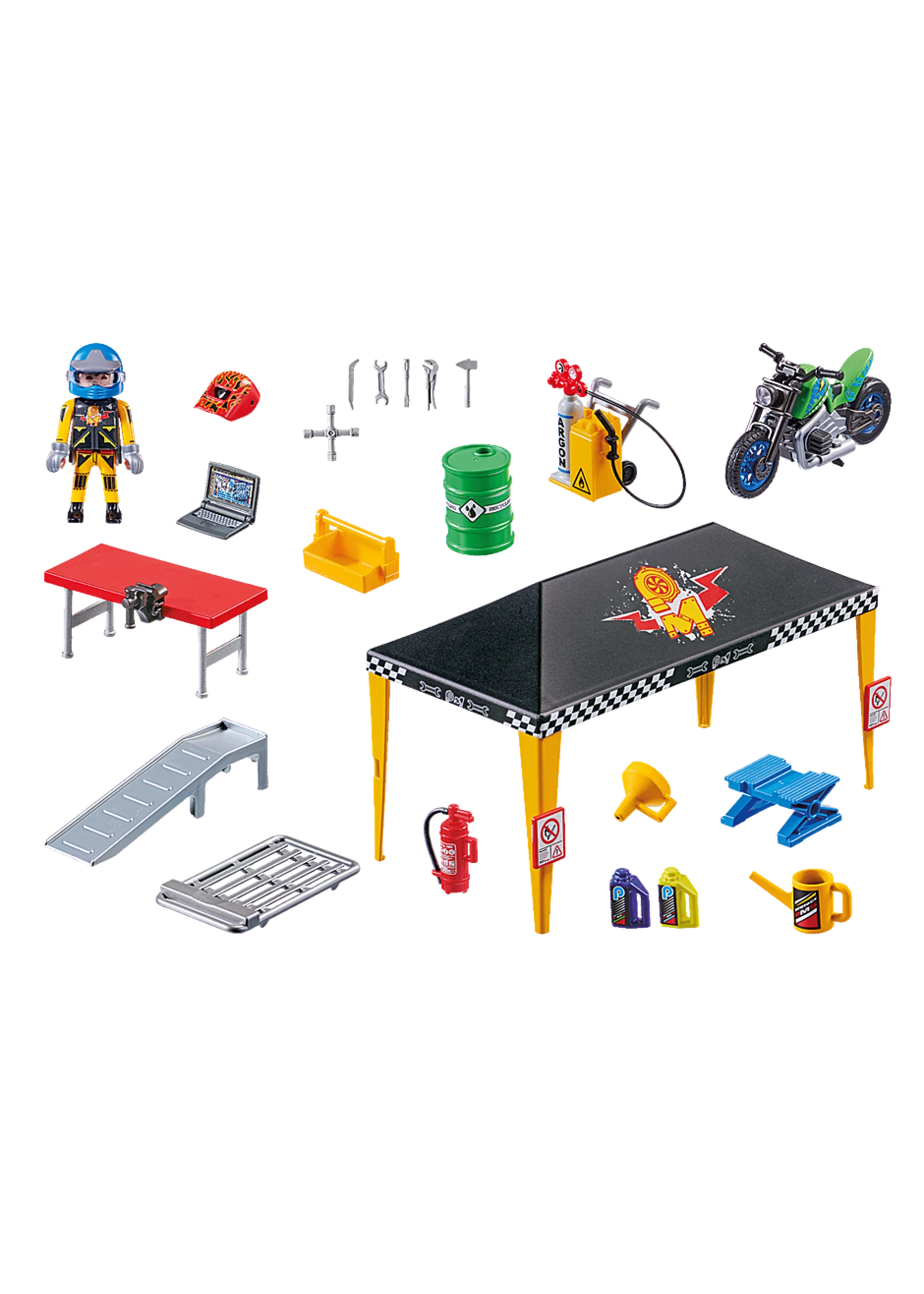 In the Stunt Show Service Tent, motorcycles and trucks are maintained. In order to examine his two-wheeler in detail, the driver has jacked up his vehicle on the lifting platform. Now it is screwed, oiled and cleaned so that the motorcycle can soon be back on the race track. A welding machine is also available for larger repairs and there are two ramps for jacking up the monster trucks and racing cars. The set contains a PLAYMOBIL figure, a motorcycle, a service tent, drive-on ramps and many accessories for repairing and maintaining the vehicles.