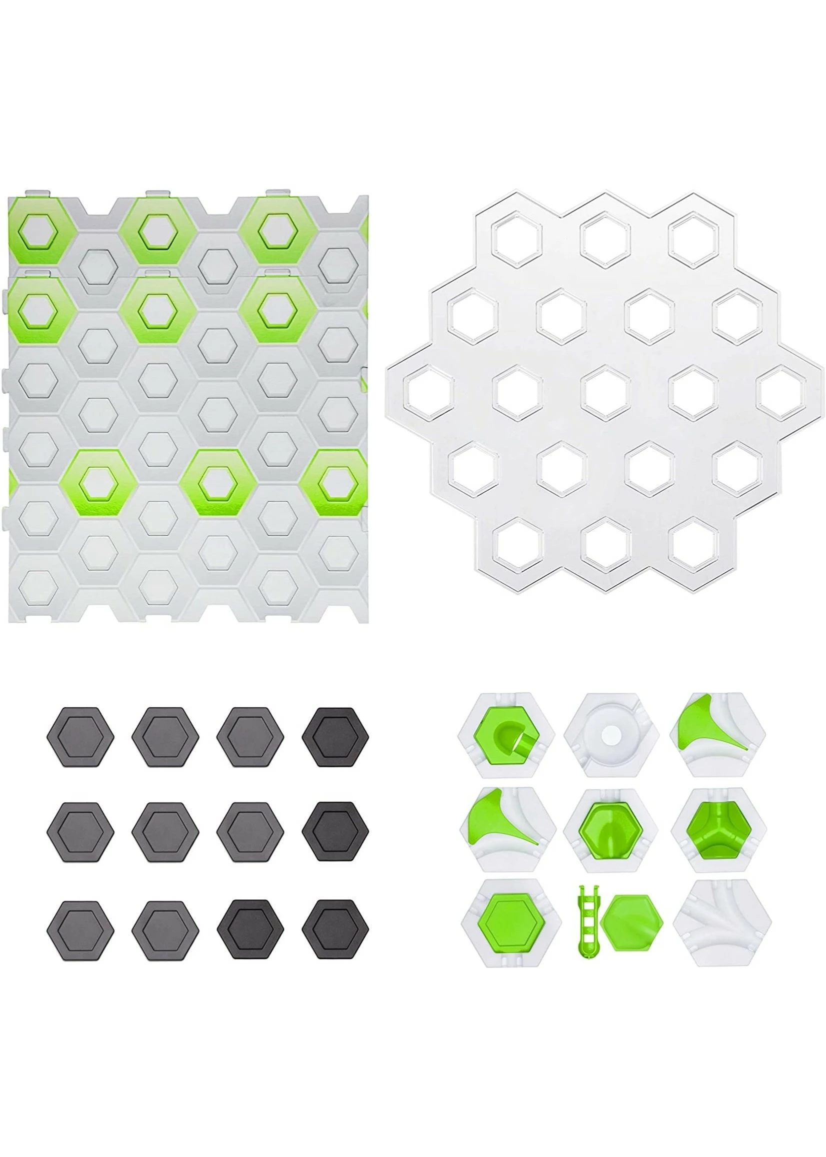 Includes – 29 expansion pieces: 2 base plates, 1 transparent level, 8 large height tiles, 4 small height tiles, 2 switches, 1 3-in-1 block, 1 Vortex, 1 finish line, 4 basic tiles, inserts for basic tiles: 2 catchers, 1 freefall, 1 Splash, 1 landing