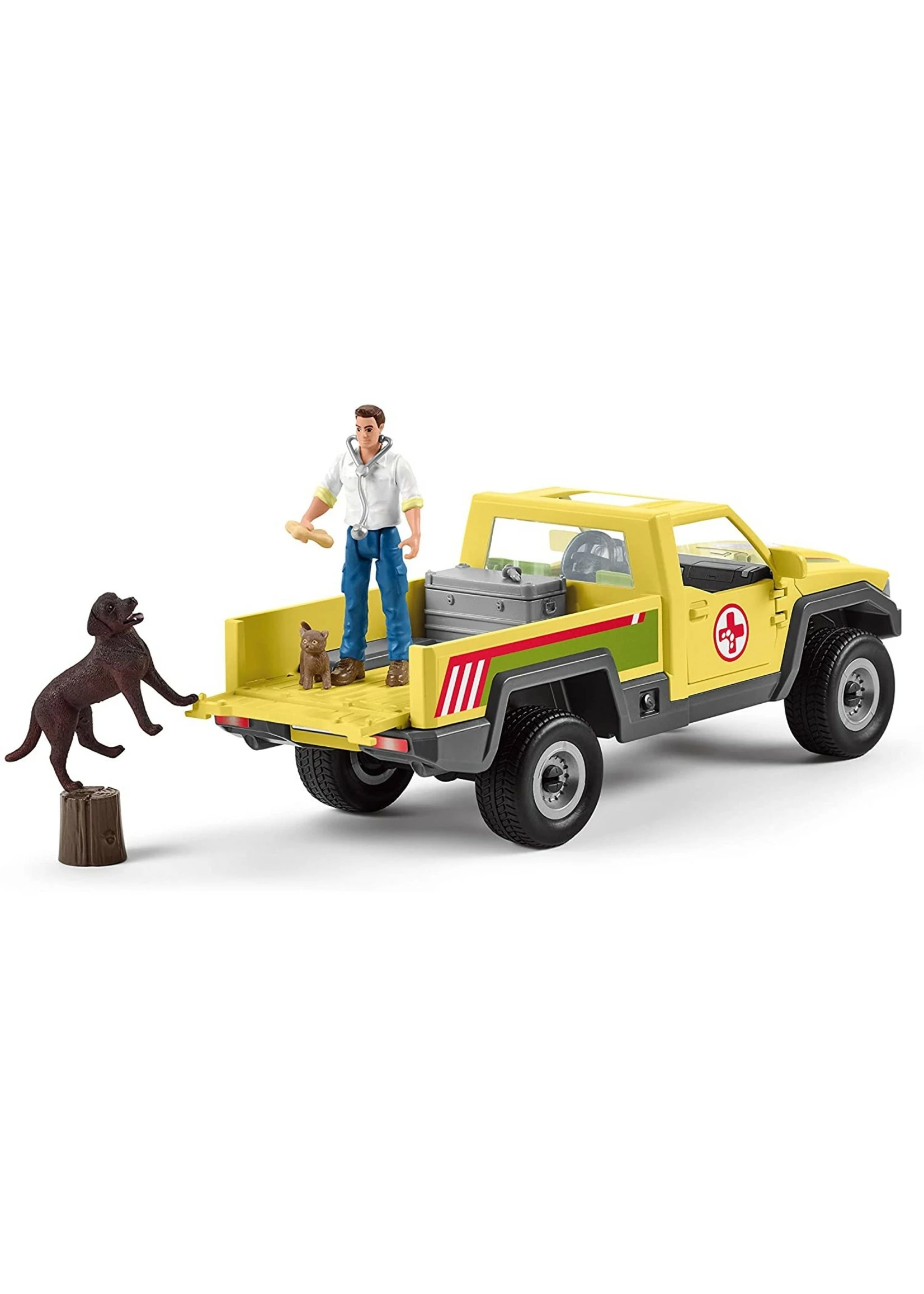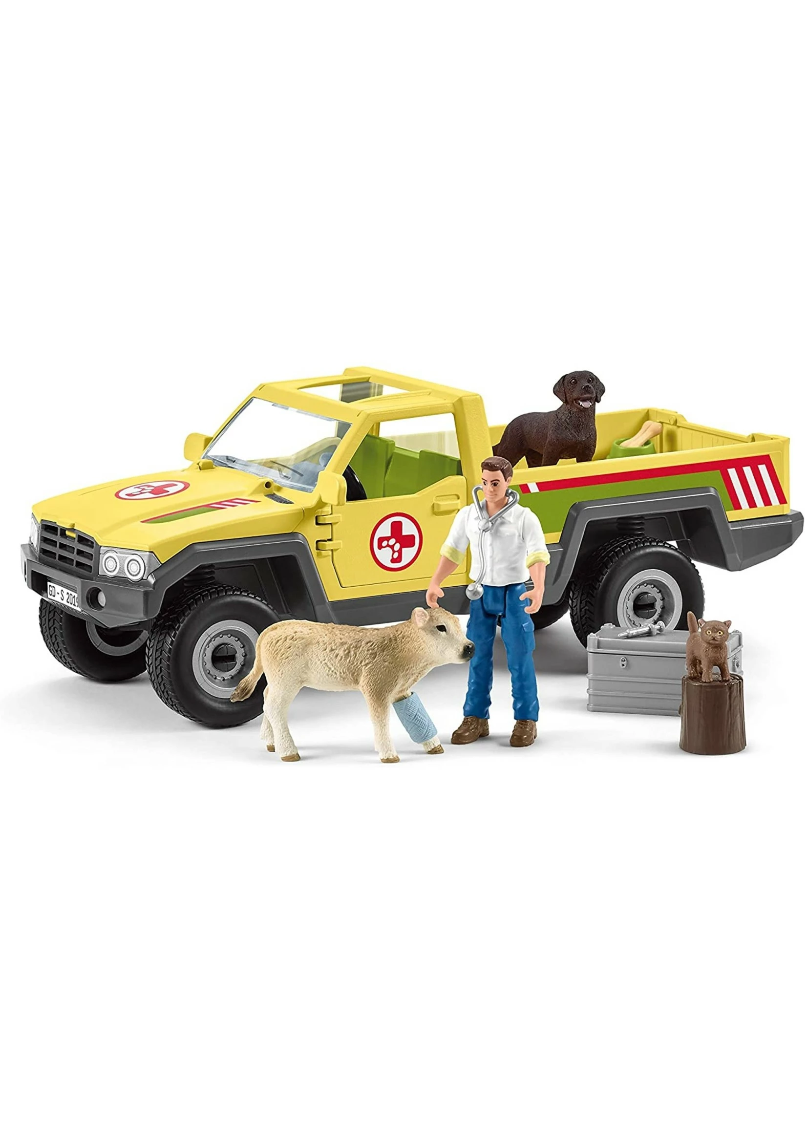 A calf on the farm has sprained its foot. The vet jumps in his pickup straight away with his Labrador and the cat, and heads off to examine the calf. The vet’s case with medication and bandages is always in the loading bay of his pickup. He bandages the calf right away and drives it to the veterinary practice. After the X-ray it can recuperate there before being taken back to the farm.