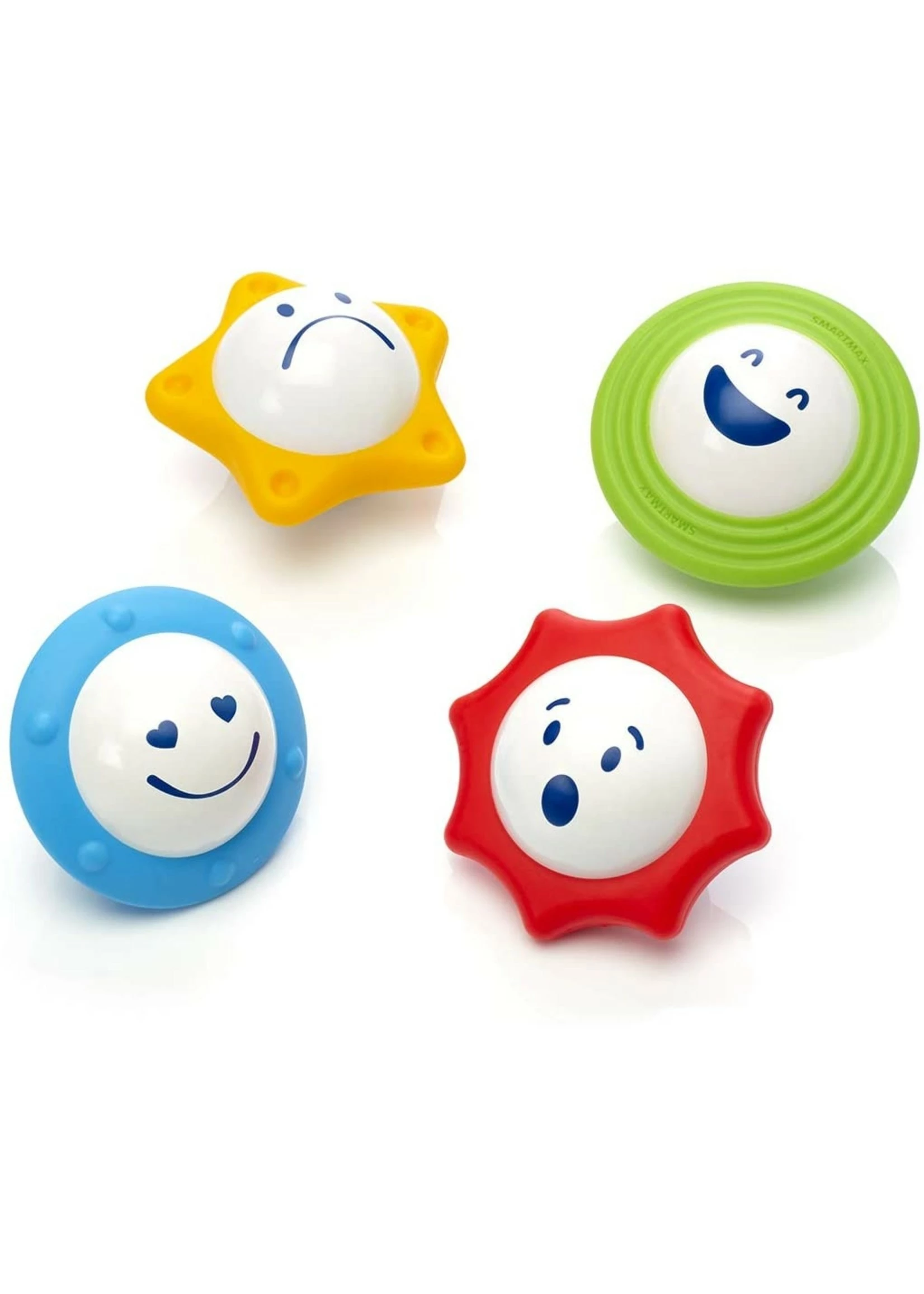My First Sounds and Senses includes 8 building pieces (4 bars and 4 balls) that feature different textures for a tactile experience, different sounds for an audible experience, and different faces to learn about emotions.